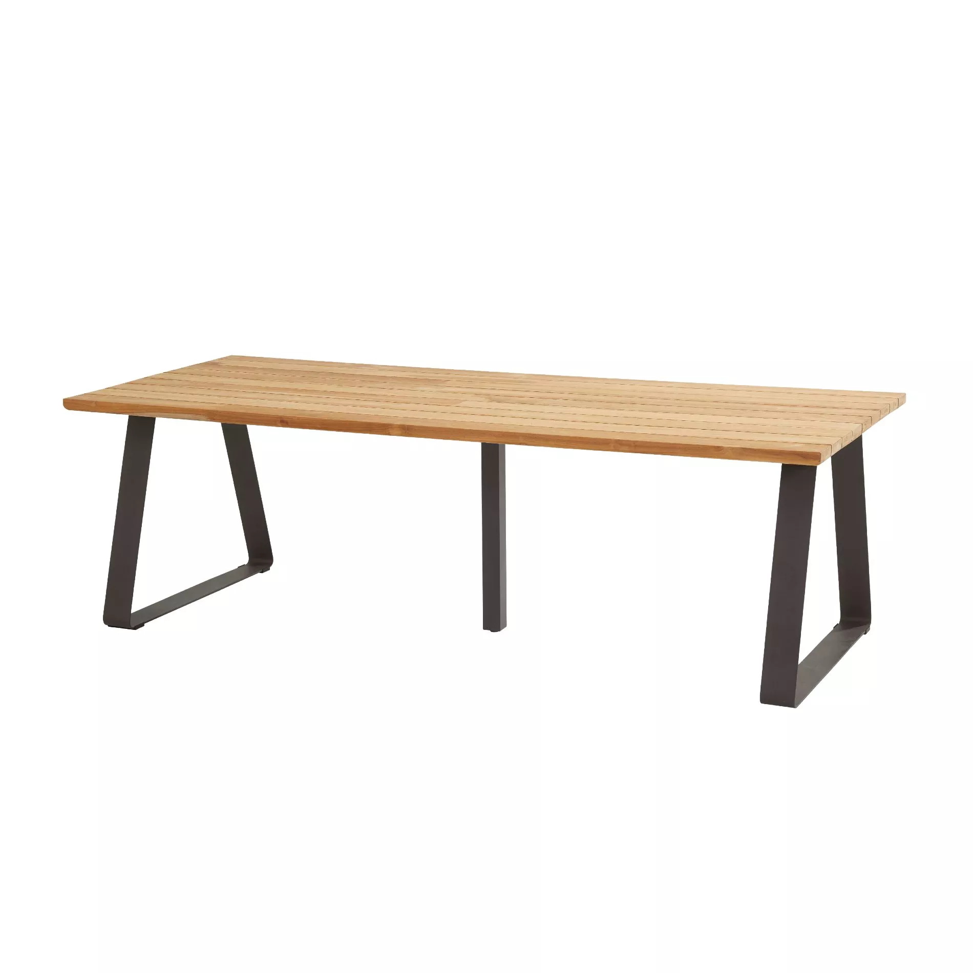 Der Gartentisch “Basso” verfügt über ein markantes Gestell in Kufenform. Die edle Tischplatte ist aus Teakholz. Dieses ist aufgrund seiner warmen Ausstrahlung und den positiven Eigenschaften ein sehr beliebtes Material für Outdoor-Möbel. Die hohe Konzentration an natürlichen Ölen verhindert die Aufnahme von zu viel Feuchtigkeit und sorgt für die hohe Widerstandsfähigkeit und Beständigkeit des Teakholzes. Mit der Zeit entwickelt Teak die typische silbergraue Patina, auch kleine Risse können hier und da entstehen, beides stellt keinen Qualitätsverlust dar. Wer die ursprüngliche Farbe des Teakholzes bevorzugt, kann durch regelmäßiges Einölen mit einem Teakpflegemittel das Vergrauen der Outdoormöbel verhindern.