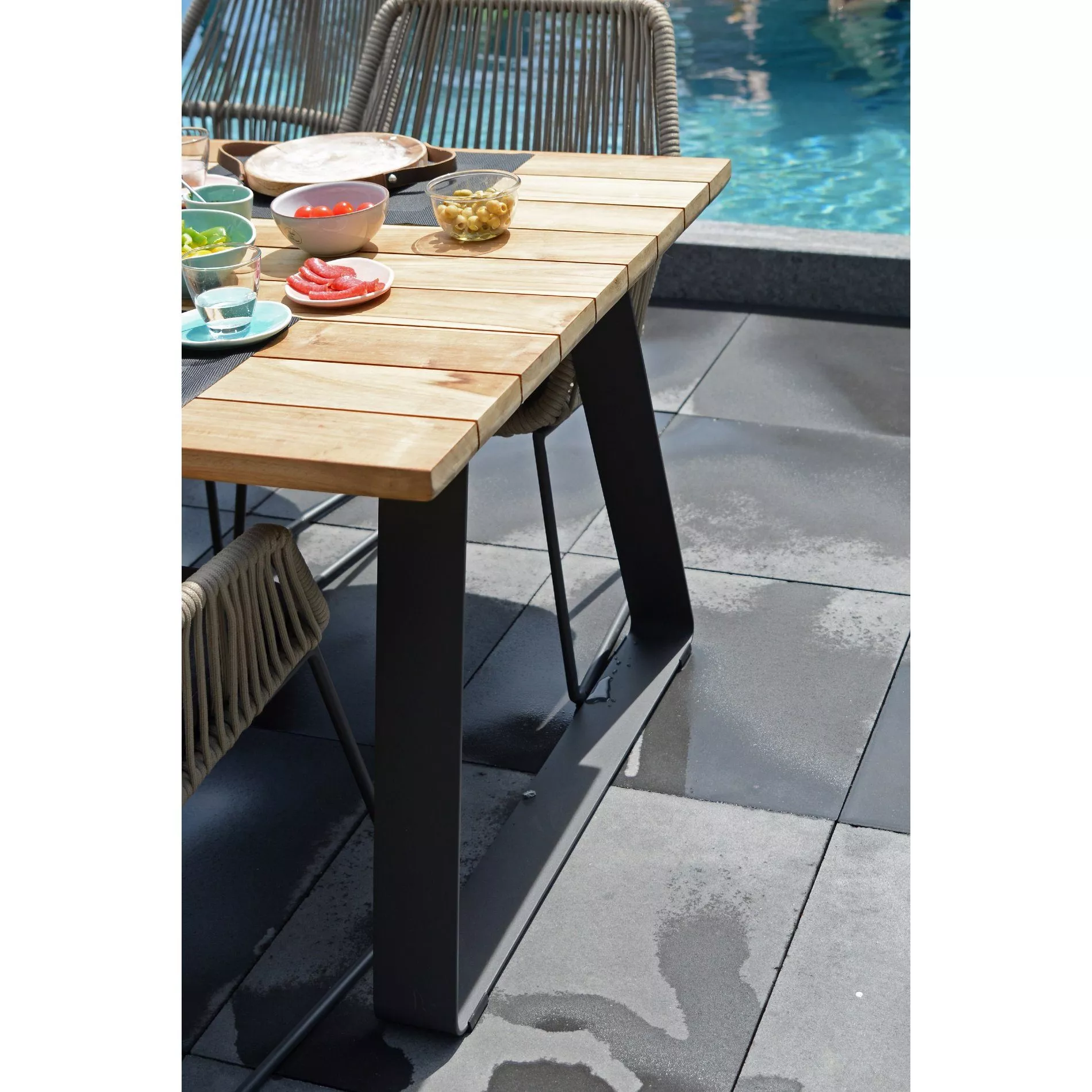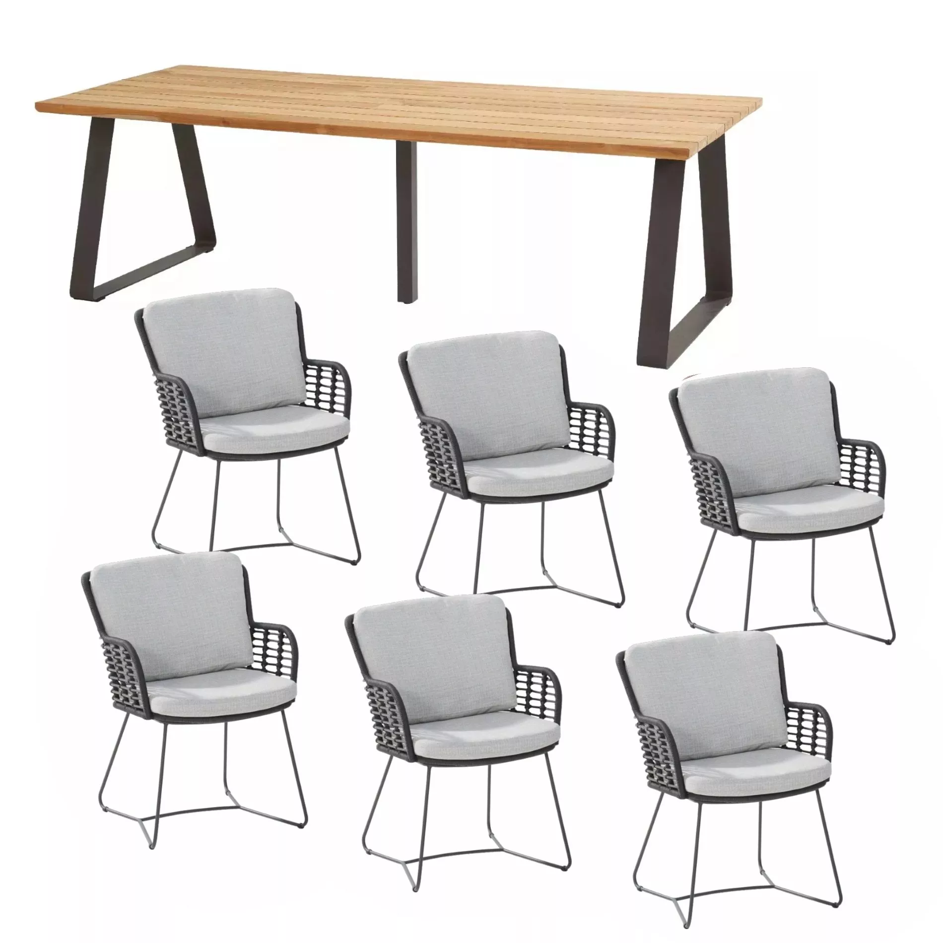 verfügt über sechs Diningsessel sowie einem Tisch mit Gestell aus anthrazitfarbenem Aluminium. Durch seine natürliche Oxidschicht ist Aluminium korrosionsbeständig und wetterfest, hinzu kommt die Pulverbeschichtung, die die Oberfläche zusätzlich versiegelt.