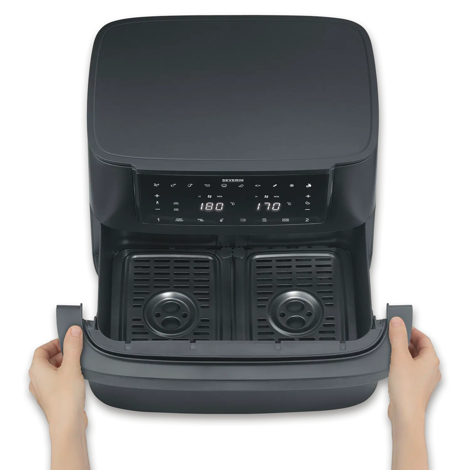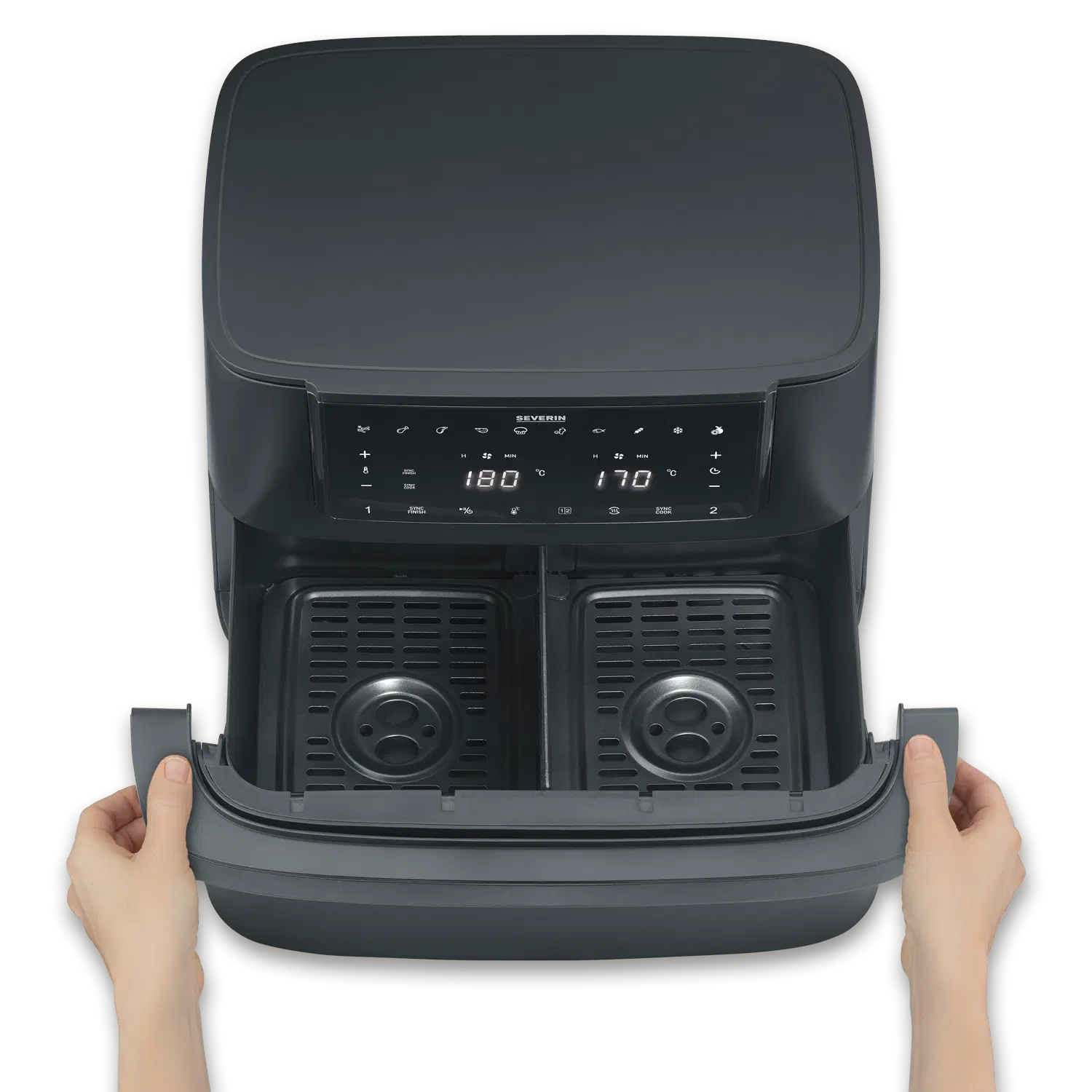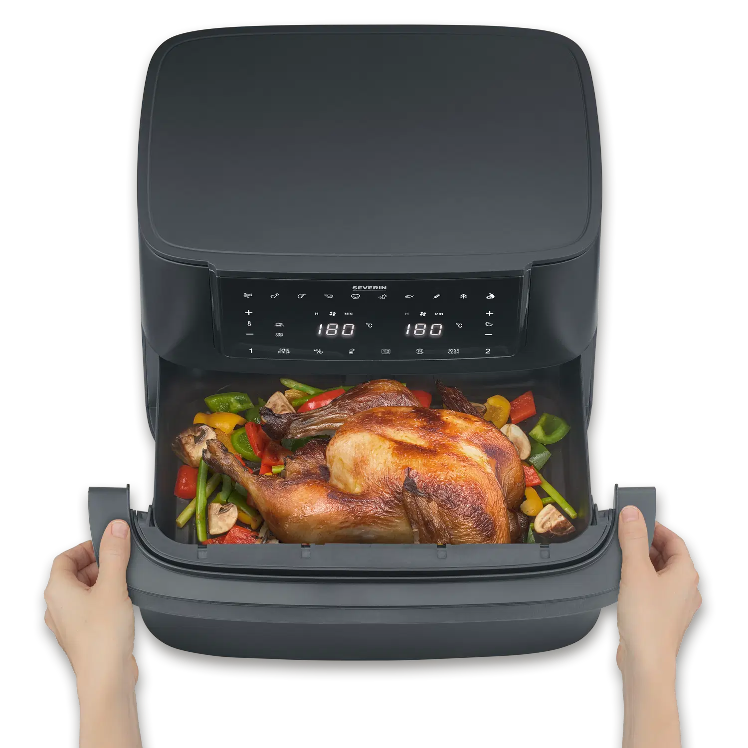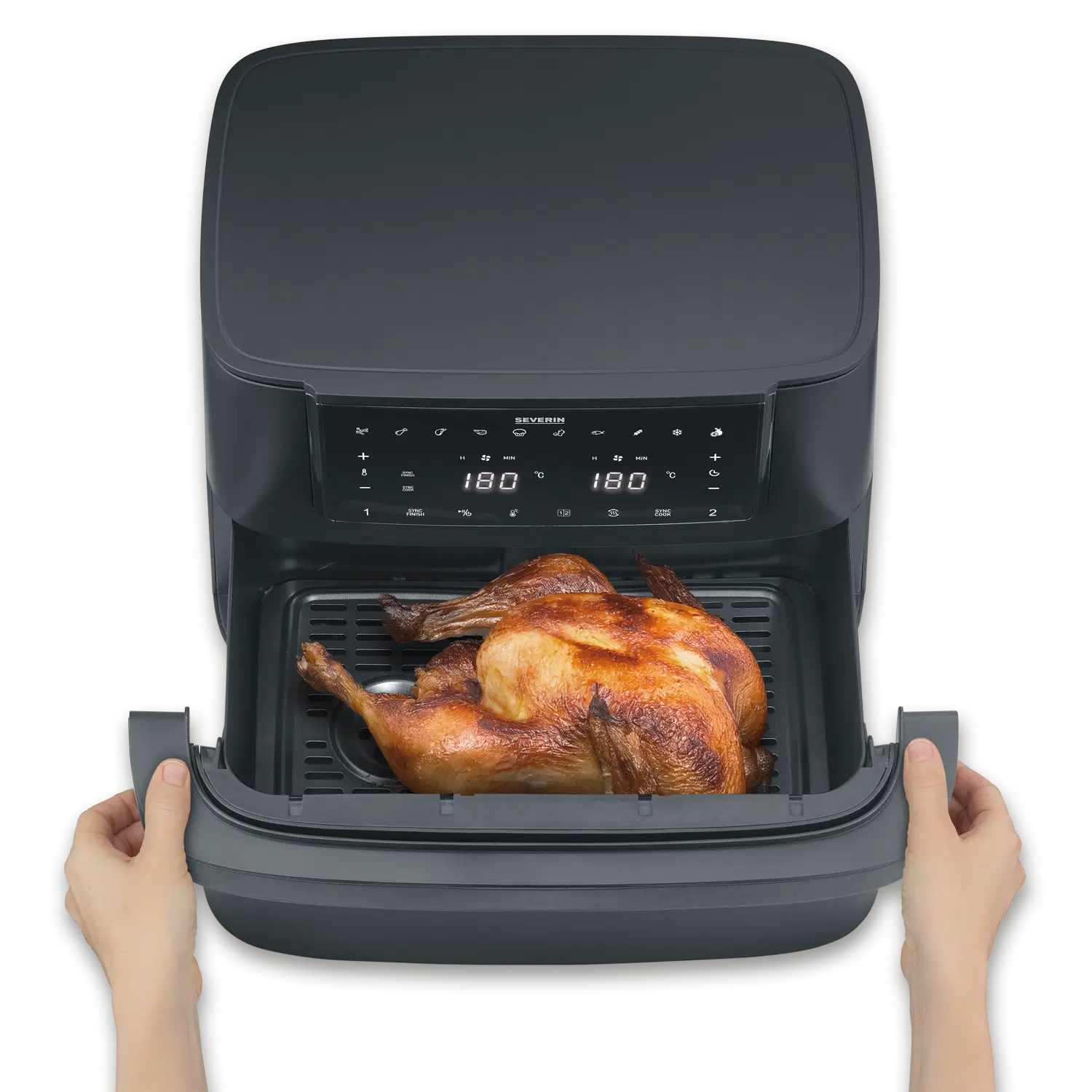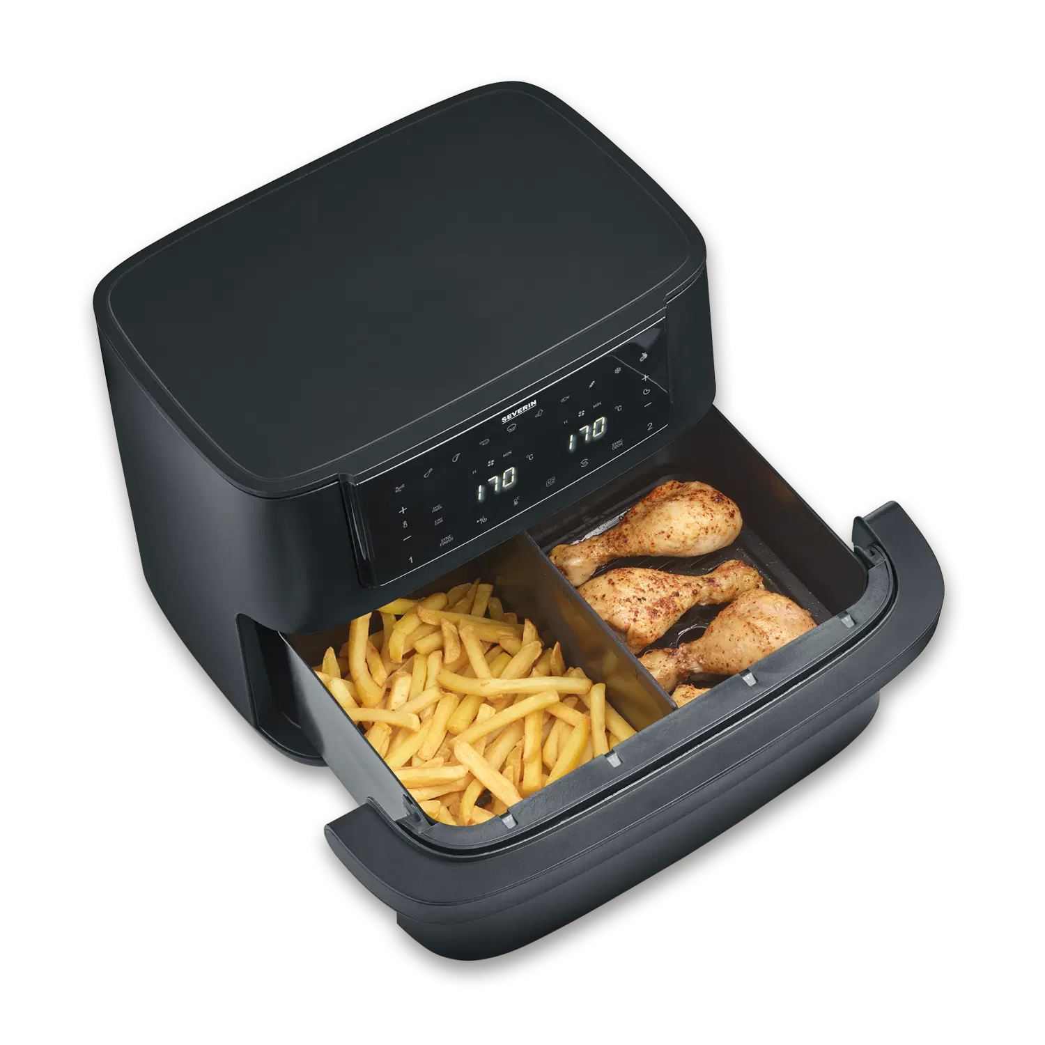 The Black Line “Flex” offers maximum versatility: the innovative Max zone can be used as an extra-large cooking space, with a partition wall as two separate zones or as a single zone – ideal for all types of preparation, from quick solo cooking to family dinners. Thanks to intelligent hot air circulation, preset programs and modern touch controls, all dishes are cooked conveniently and with crispy results. Black Line “Flex” – for everyone who needs more flexibility in the kitchen. Without compromise.