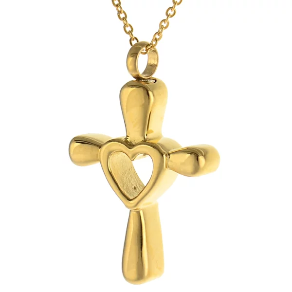 Asche Anhänger Kreuz mit Herz zum Befüllen aus Edelstahl poliert in der Farbe Gold
