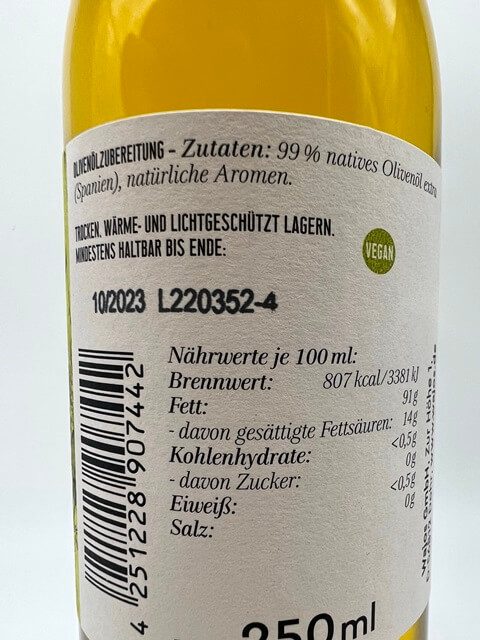 Zutaten: 99% natives Olivenöl extra (Spanien), natürliches Basilikum Aroma, natürliches Aroma.