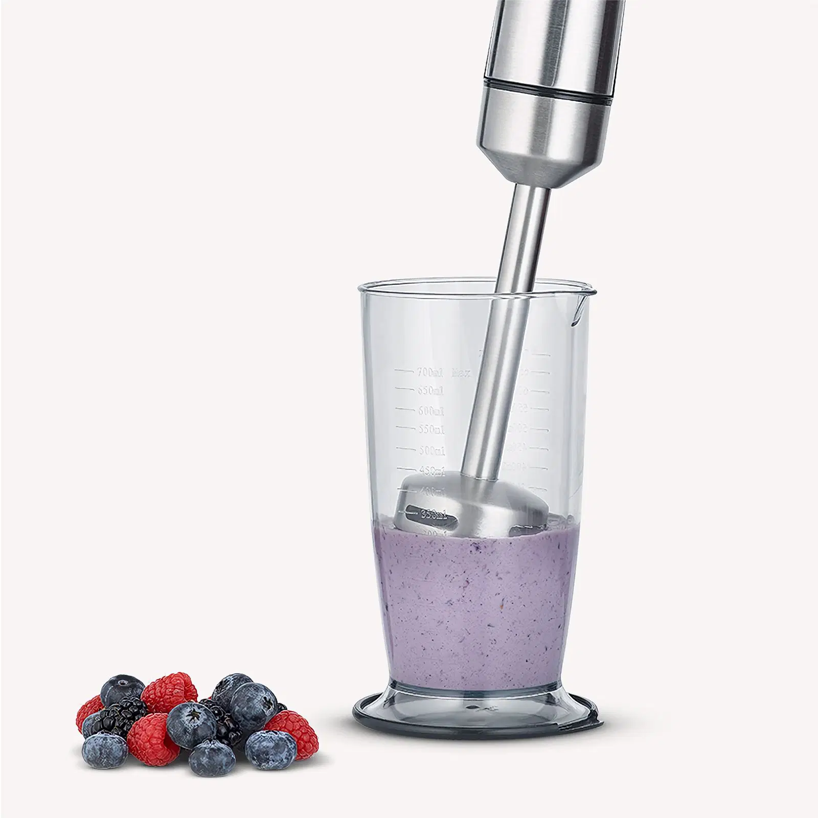 Un potente conjunto, con 1000 W y cuchillas de acero inoxidable de alta calidad de 4 hojas, para conseguir purés finos incluso con los ingredientes más duros. Con un diseño ergonómico de acero inoxidable con varilla para remover de acero inoxidable extraíble para una limpieza fácil y un trabajo cómodo. Incluye jarra de mezclas con tapa (capacidad de 0,7 l), lo que la hace perfecta para batir y servir individualmente. La batidora de mano no contiene BPA para un disfrute saludable.