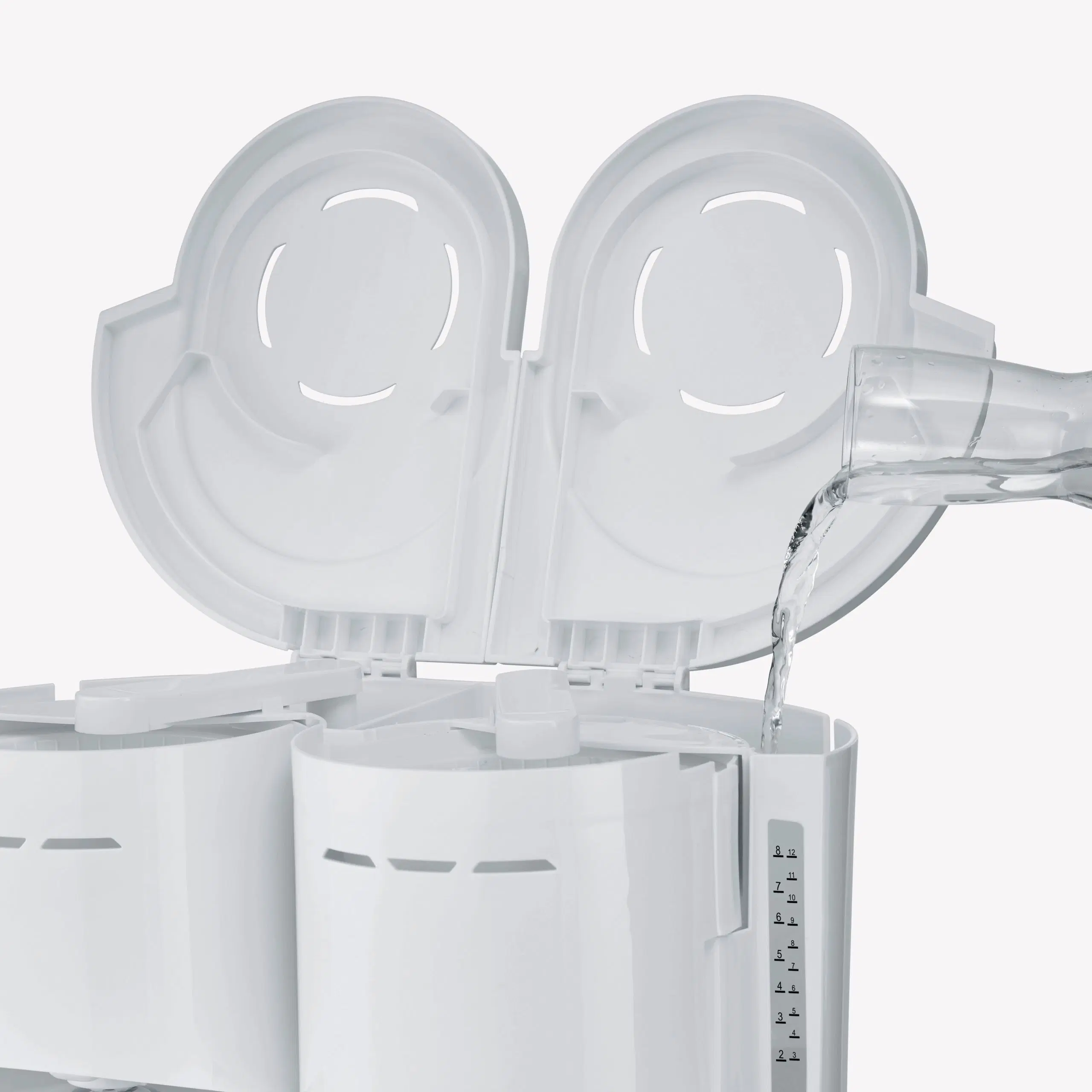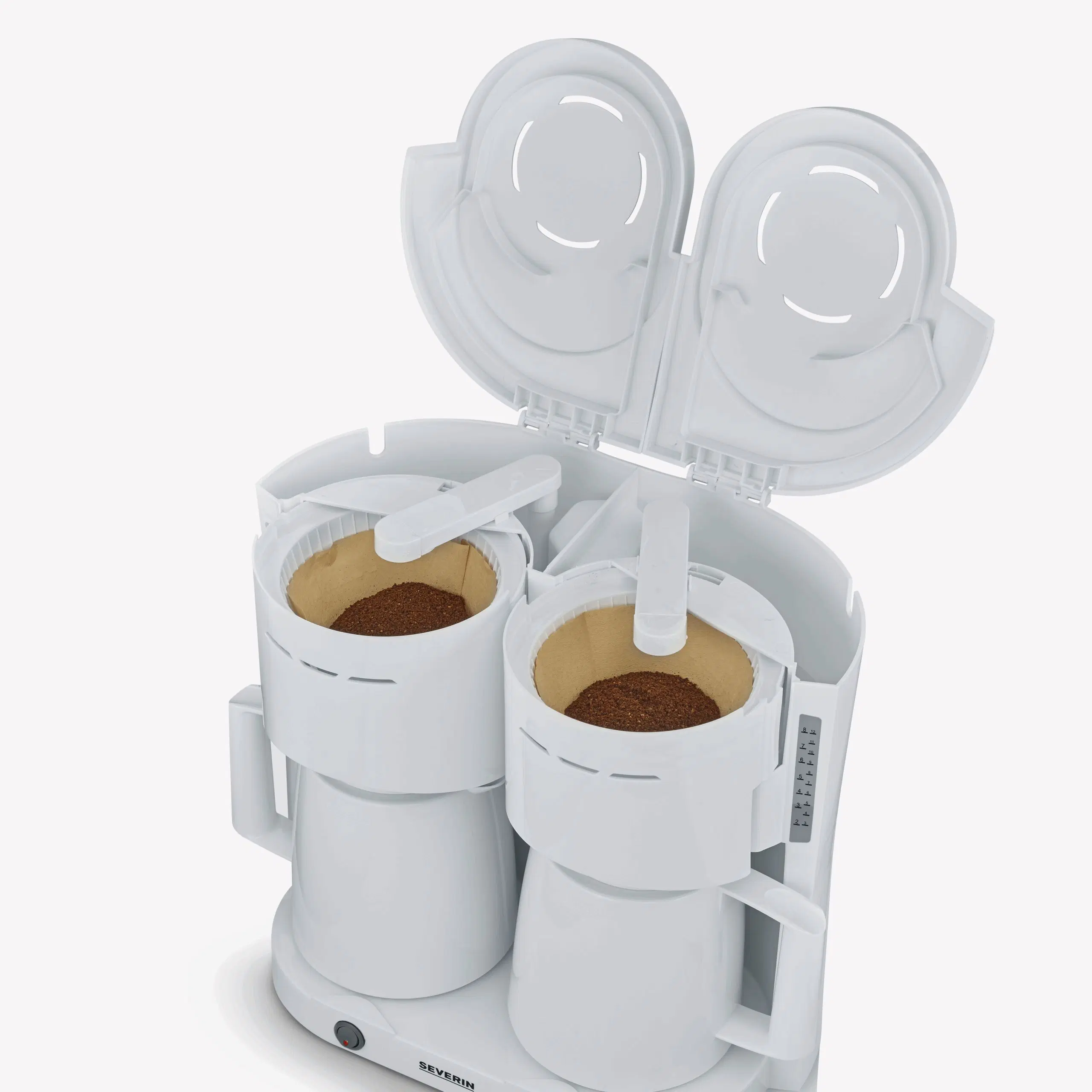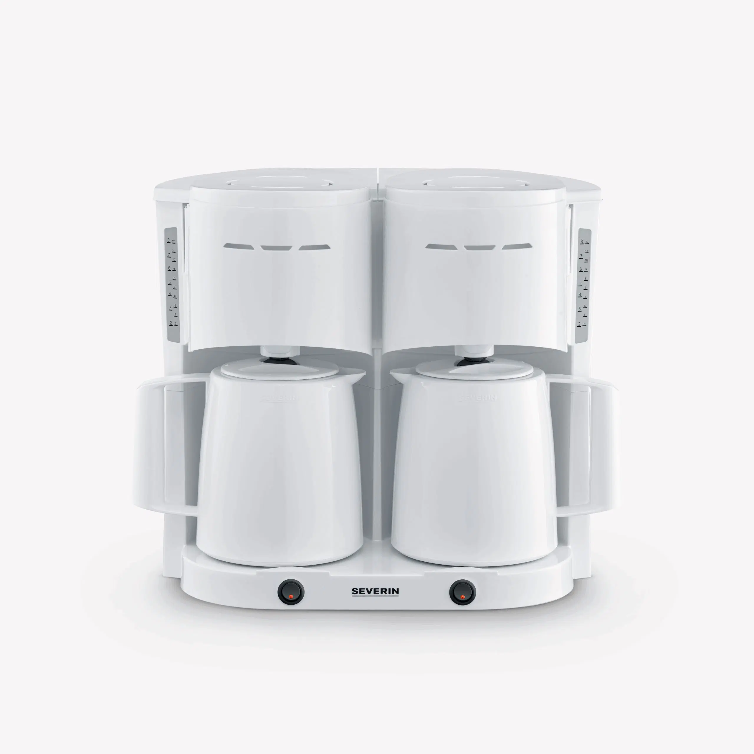Nuestra cafetera de filtro dúo ofrece el doble de potencia, aproximadamente 1.000 W cada una, y viene con 2 jarras térmicas, cada una de ellas equipada con tapas para colar y con capacidad para hasta 8 tazas de café. Cada jarra tiene un filtro giratorio de 1 x 4, desconexión automática y un indicador del nivel de agua en ambos lados para una mayor facilidad de uso.