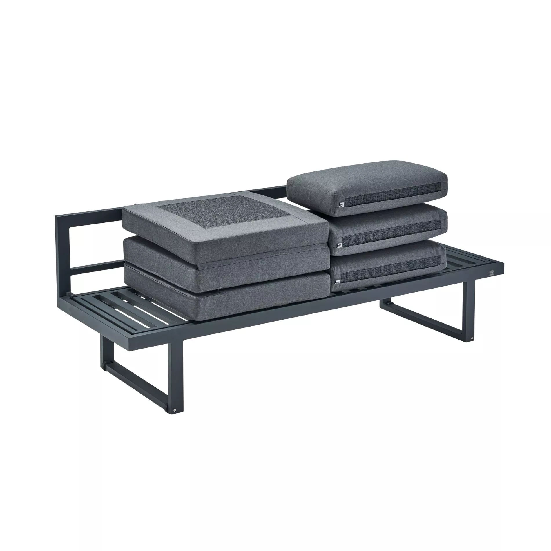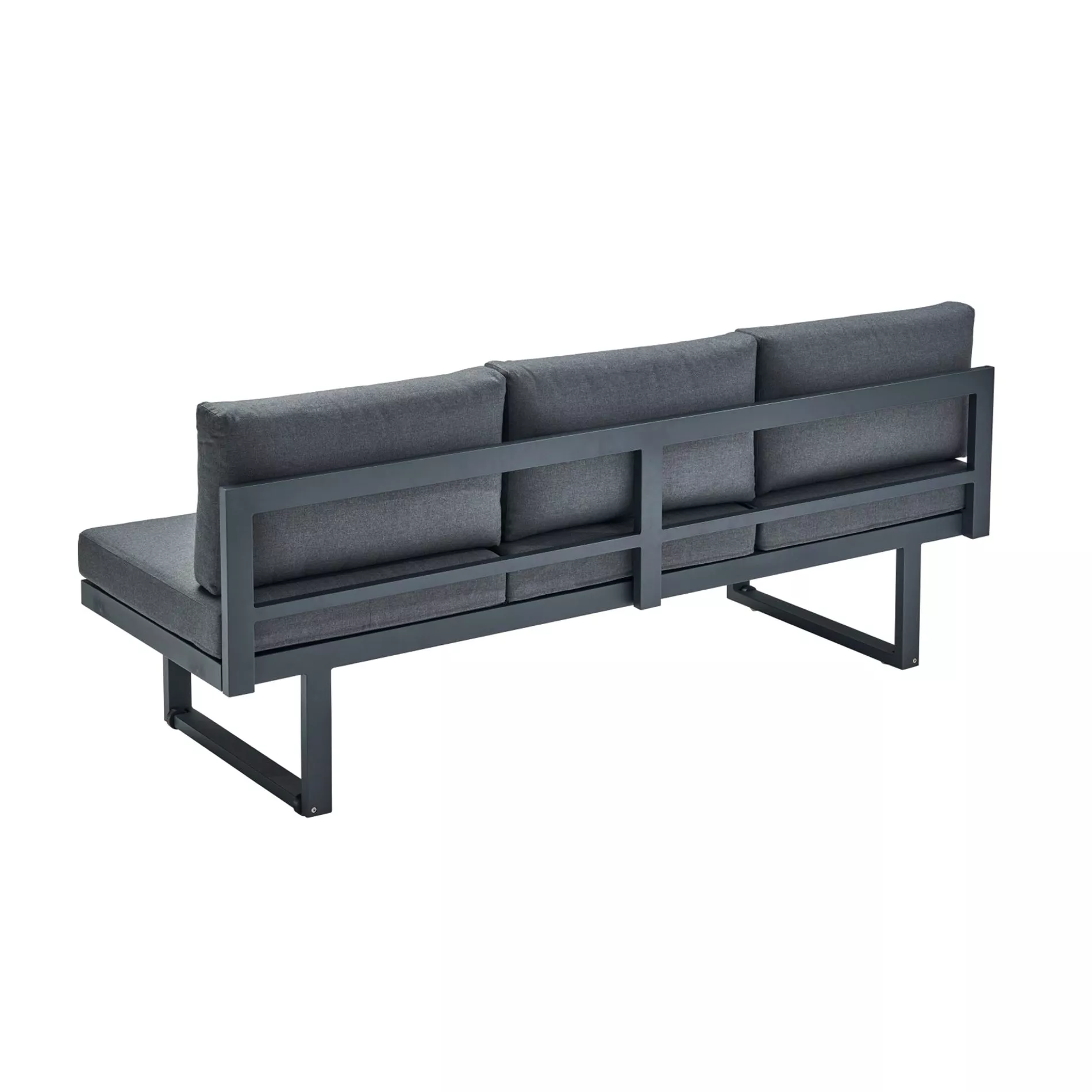 Das Gestell des 3-Sitzers besteht aus pulverbeschichtetem anthrazitfarbenem Aluminium, einem äußerst robusten, aber dennoch vergleichsweise leichten Metall. Aluminium ist von Natur aus resistent gegen Korrosion und eignet sich daher hervorragend für den Einsatz im Freien. Dadurch erfordert es nur minimalen Pflegeaufwand. Die DuPont® Pulverbeschichtung verleiht dem Gestell eine seidenmatte Farbgebung und schützt die Oberfläche gleichzeitig vor Witterungseinflüssen.