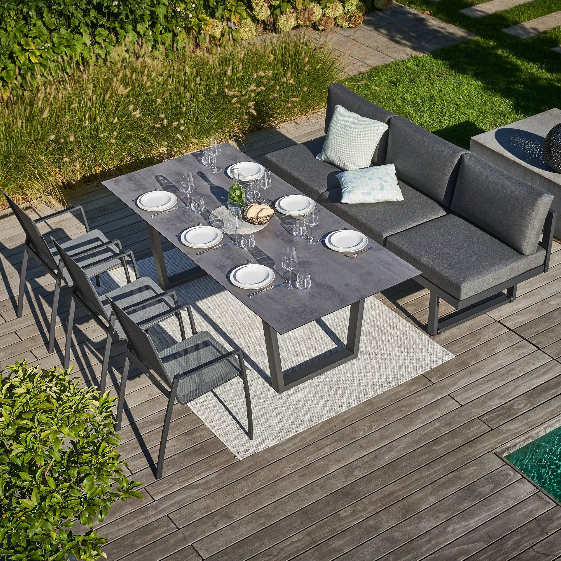 Zu Ihrem Diningset “Aragona/Falerna/Mineo“ lassen sich ideal weitere Module in Aluminium oder Edelstahl anthrazit der Serie “Aragona” oder Stühle der Serie “Mineo” kombinieren. Lassen Sie sich von unserer vielfältigen Auswahl inspirieren. Die Möbel Ihres Sets sind für den Einsatz im Freien konzipiert und überzeugen durch ihre wetterfeste Qualität. Um Tisch und Sitzmöbel vor Wetterextremen und Verschmutzungen zu bewahren, raten wir zu einer atmungsaktiven Schutzhülle.