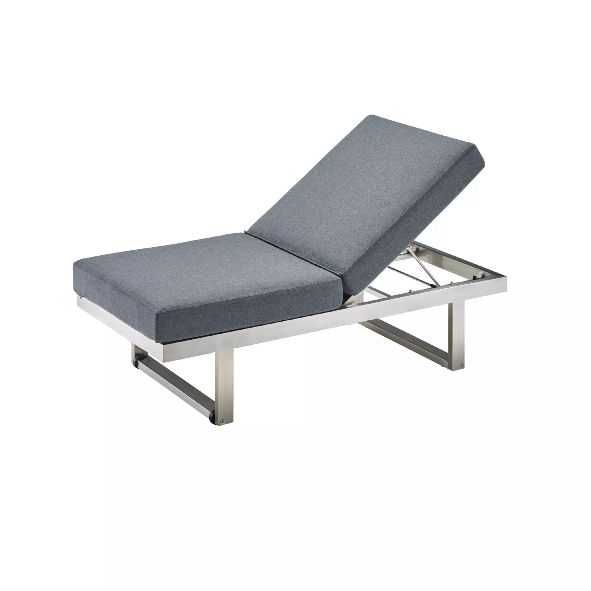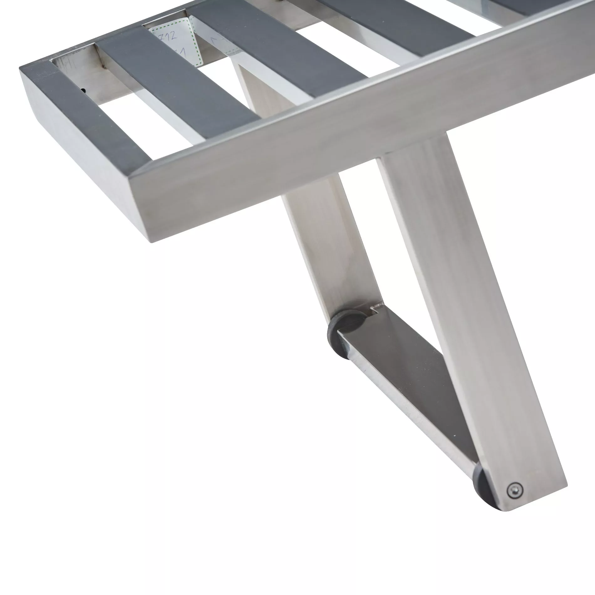 Basis des Seitenteils ist ein Gestell aus gebürstetem Edelstahl 304: standfest, wetterfest, korrosionsbeständig. Rückenlehne und Armlehne sind zusätzlich mit 16 mm breiten Bändern bespannt. Dieses Outdoor-Rope besteht aus 100% Polypropylen, ist daher UV-beständig und hat eine wasserabweisende Oberfläche.