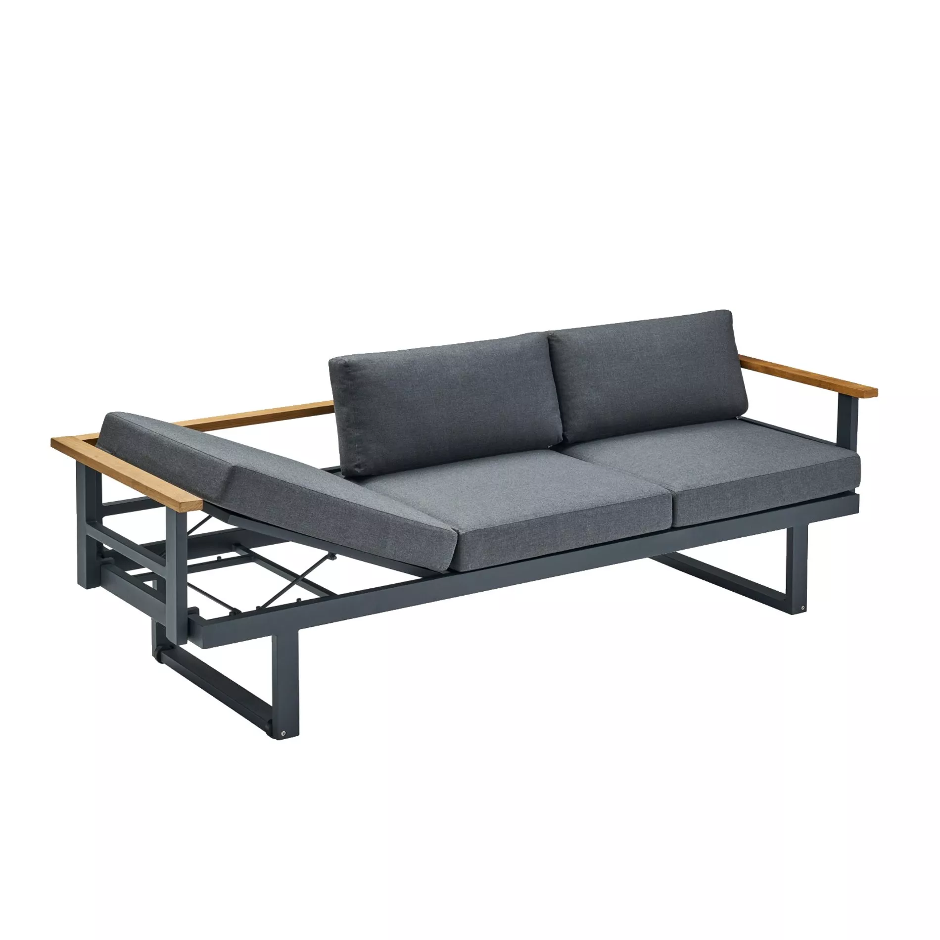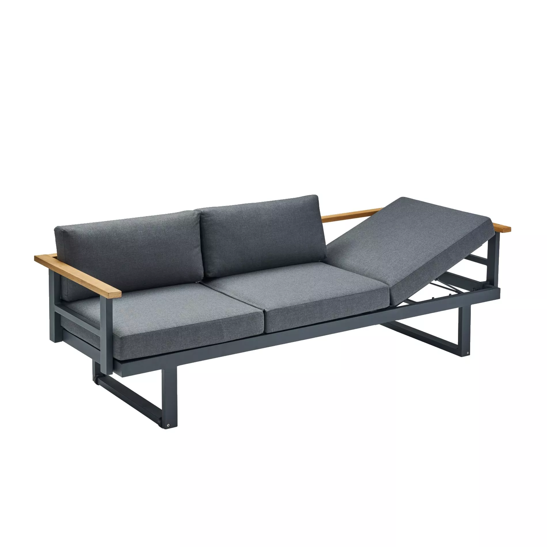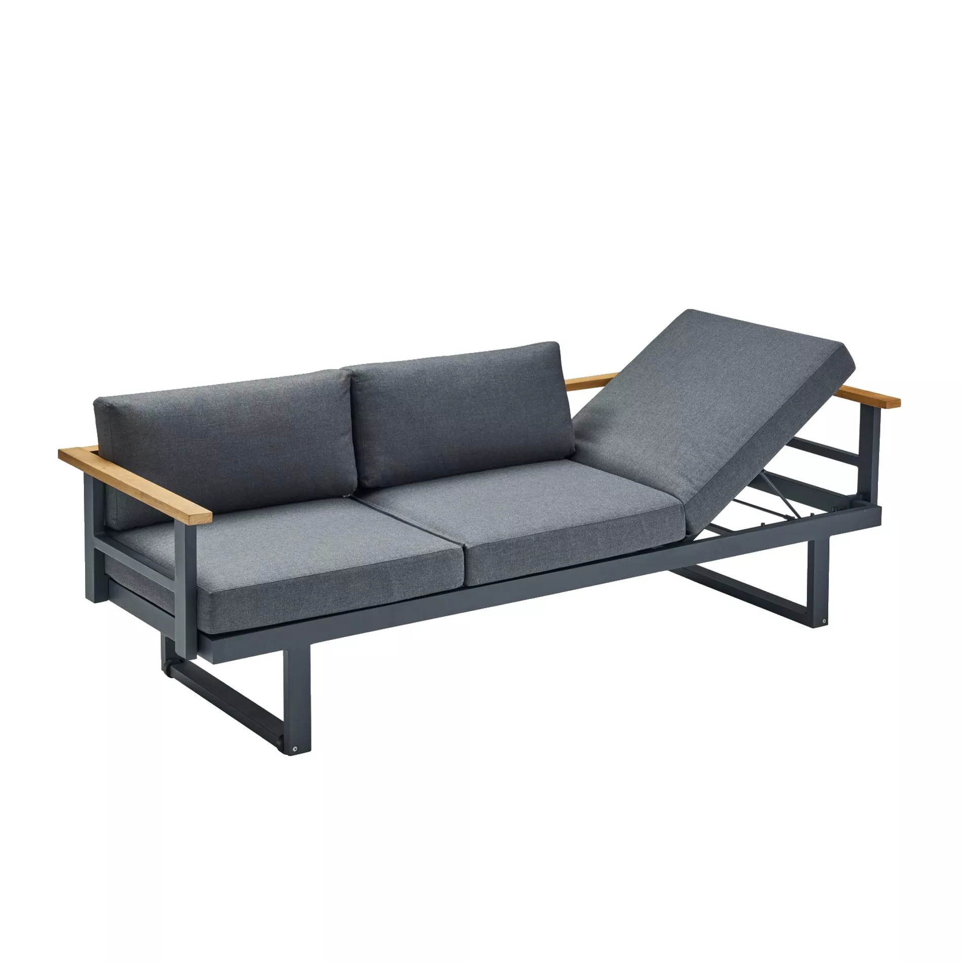 Das einladende Loungeset “Aragona” der Marke CASA DOMA besteht aus einem 3-Sitzer Loungesofa und einem 2-Sitzer Seitenteil, die in Kombination eine komfortable Ecklounge ergeben und vier Personen bequem Platz bieten. Der dazu passende Loungetisch “Aragona” nimmt mit seiner Tischplatte aus Teakholz eine schöne Verbindung zur umlaufenden Teakleiste der Sitzmöbel auf. Die stabilen, mattierten Gestelle aus anthrazitfarbenem Aluminium ergänzen den modernen Look. Die wetterfesten Polster aus Tuvatextil® laden zum Entspannen und Verweilen ein. Dank verstellbarer Seitenteile finden Sie auch im Liegen eine gemütliche Position.