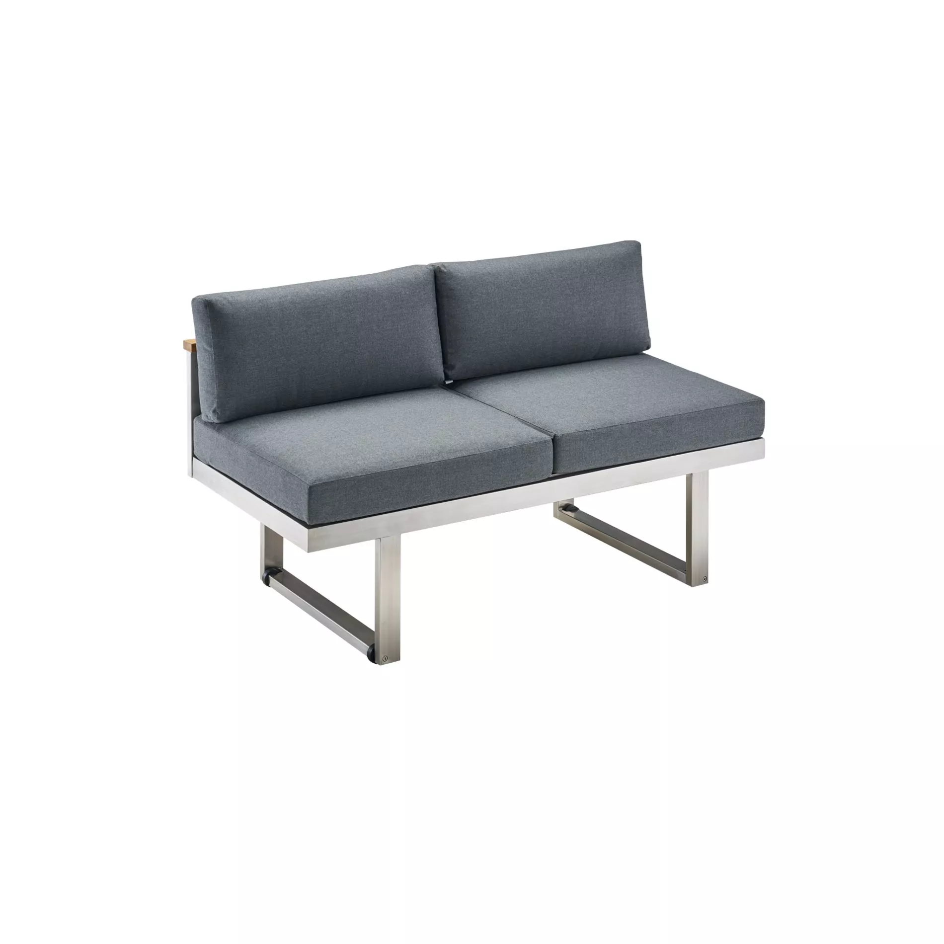 Die Module zeichnen sich durch ihr hochwertiges Kufengestell aus gebürstetem Edelstahl aus. Bei CASA DOMA wird Edelstahl der Güteklasse 304, auch bekannt als 18/10-Edelstahl, verwendet. Diese Legierung besteht aus 18% Chrom und 10% Nickel und bietet eine ausgezeichnete Korrosions- und Witterungsbeständigkeit. Zudem ist es äußerst pflegeleicht. Das Metall hat eine fein gebürstete Oberfläche, die ihm einen matten Glanz verleiht. Die Sitzflächenbasis besteht aus Edelstahl-Latten. Der 3-Sitzer und der 2-Sitzer verfügen über praktische Rollen an beiden Seiten, die das Bewegen der Loungemodule erleichtern.