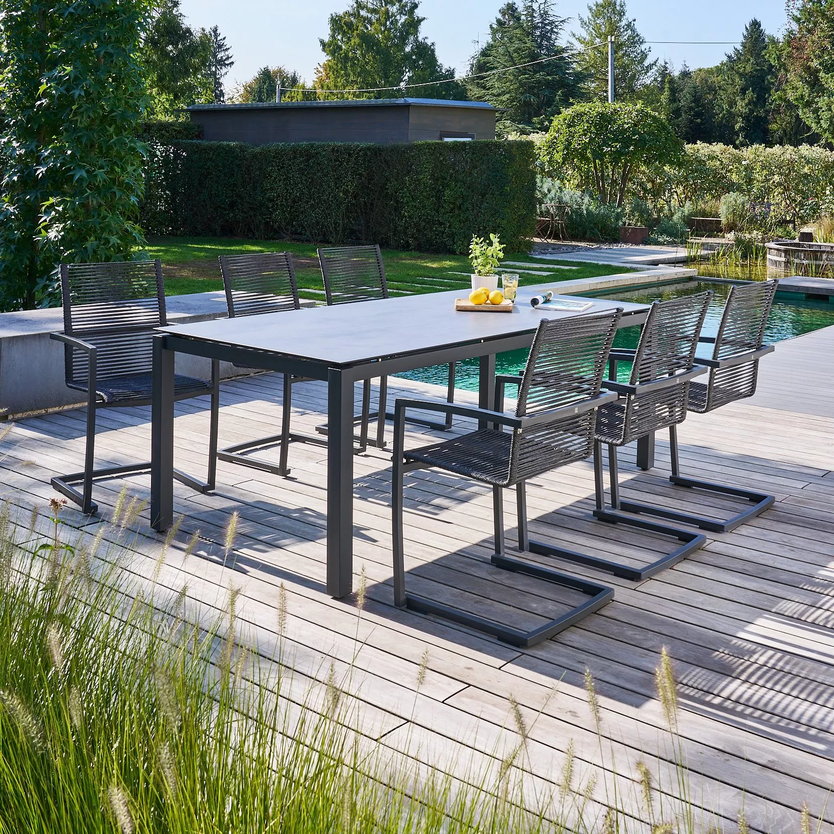 besteht aus einem Gartentisch und sechs Freischwingern. Dank Gestellen aus pulverbeschichtetem Edelstahl sind die Möbel besonders stabil und standfest. Das korrosionsbeständige Metall wird durch eine DuPont® Pulverbeschichtung in Anthrazit veredelt, die ihm eine seidenmatte Optik verleiht. Zusätzlich schützt die Beschichtung die Oberfläche des Stahls und verbessert seine Widerstandsfähigkeit gegenüber äußeren Einflüssen.