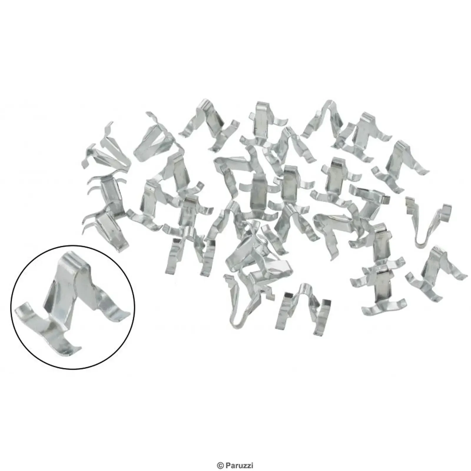 Die für die Karosserieformteile vorgesehenen Kunststoff-Zierklammern des Volkswagen Käfer, Karmann Ghia und Typ 3 werden direkt in das Blech eingesetzt und klemmen erst durch Drücken eines Klemmstifts. Montieren Sie zunächst alle Klammern an der Karosserie und verriegeln Sie diese mit den Stiften, bevor Sie die Zierleiste aufdrücken. Wenn Metallklammern verbaut sind, werden diese beim VW Käfer und Typ 3 zunächst in den Zierrahmen geschoben und anschließend in die Aussparungen der Karosserie gedrückt (diese müssen vorher mit Gummis versehen werden, um Klappergeräusche und die Gefahr von Beschädigungen zu reduzieren). ). entgegenwirken). Die Zierrahmenklammern des Volkswagen Bus werden verschraubt, anschließend wird der Zierrahmen darüber geklickt.