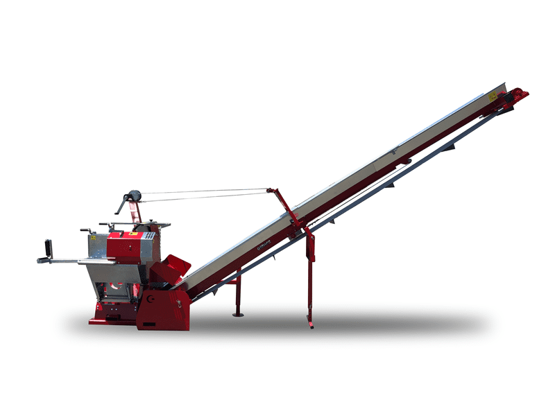 Eine für die Brennholzverarbeitung kombinierte Säge, bestehend aus der bewährten Super Pro-Kreissäge und einem Förderband mit variabler Länge zwischen 2m, 4m oder 5m und einer variablen Breite zwischen 250mm oder 400mm.