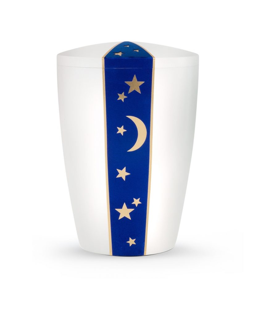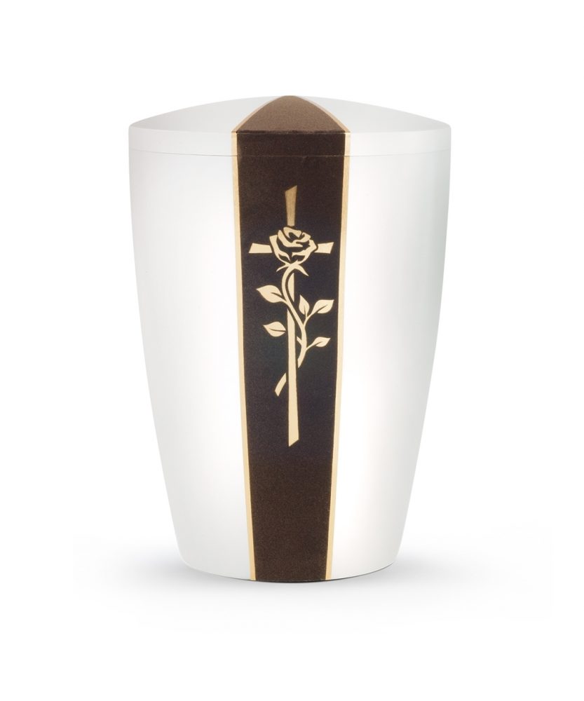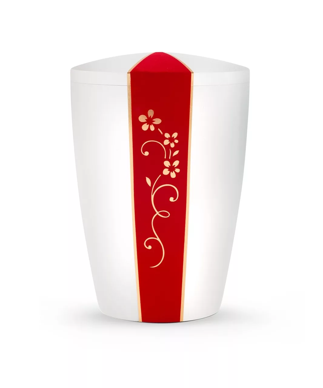 Die perlmutt- schillernde Oberfläche dieser Urnen wird durchbrochen von vertikalen Dekorbändern aus Samt. Diese sind von Goldstreifen eingefasst. Die gold schimmernden Motive kommen durch den Kontrast zu den matten Samtfarben besonders gut zur Geltung.
