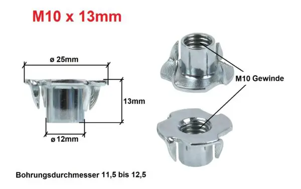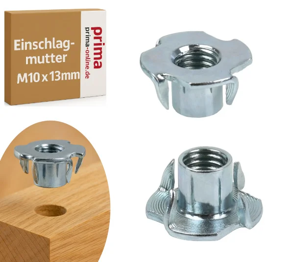 Einschlagmutter M10 x 13 mm ist ideal zur Gewindeverstärkung in Holz geeignet. Dank ihrer 4 spitzen bietet sie verdrehsicheren Halt. Der verzinkte Stahl schützt zusätzlich vor Korrosion – perfekt für Möbelbau und Innenmontage.