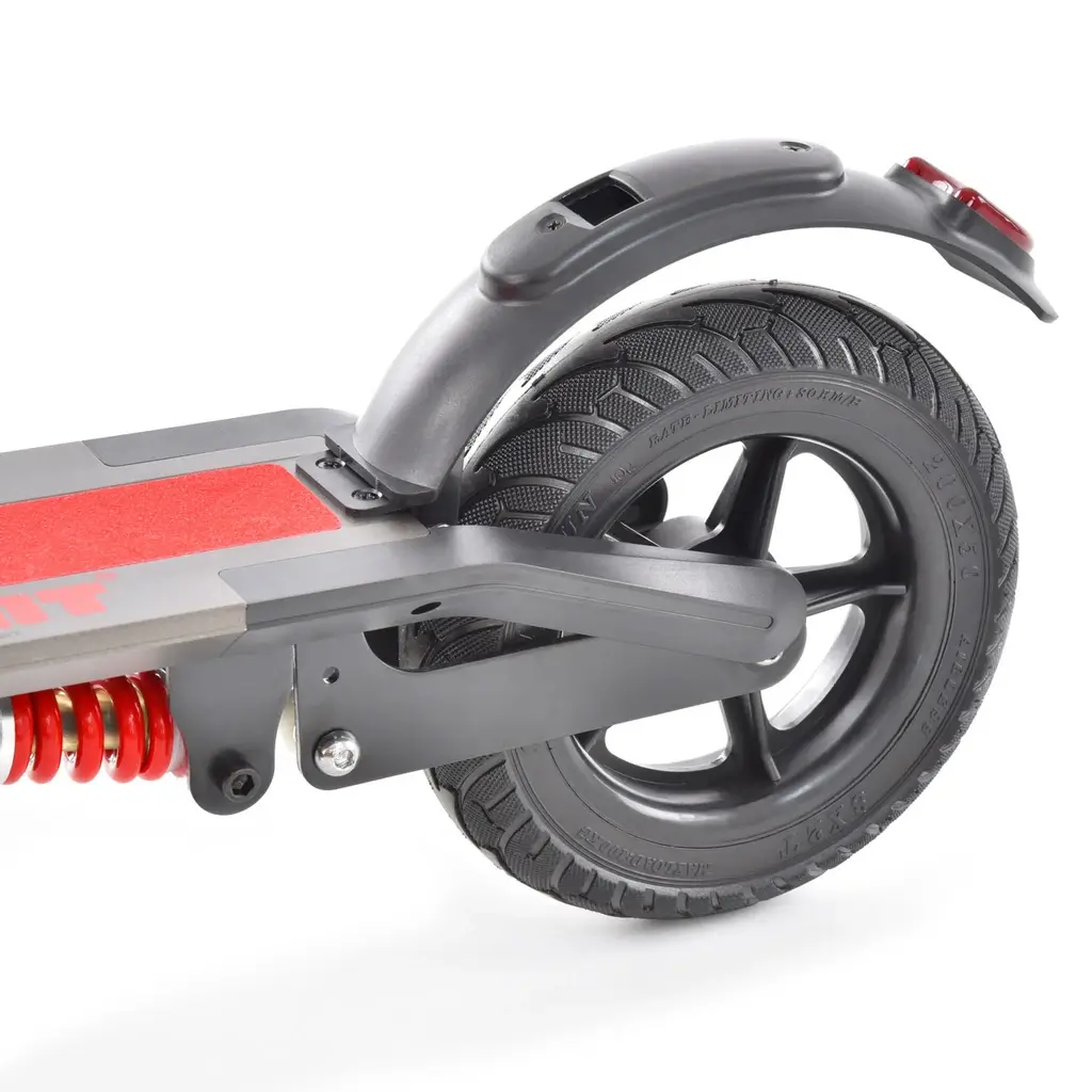 Um die Fahrt komfortabler zu gestalten, ist das Hinterrad gefedert. Der Durchmesser der Räder beträgt 8″. Auch der kleine Ständer, der auf dem Scooter montiert ist, ist absolut nützlich.