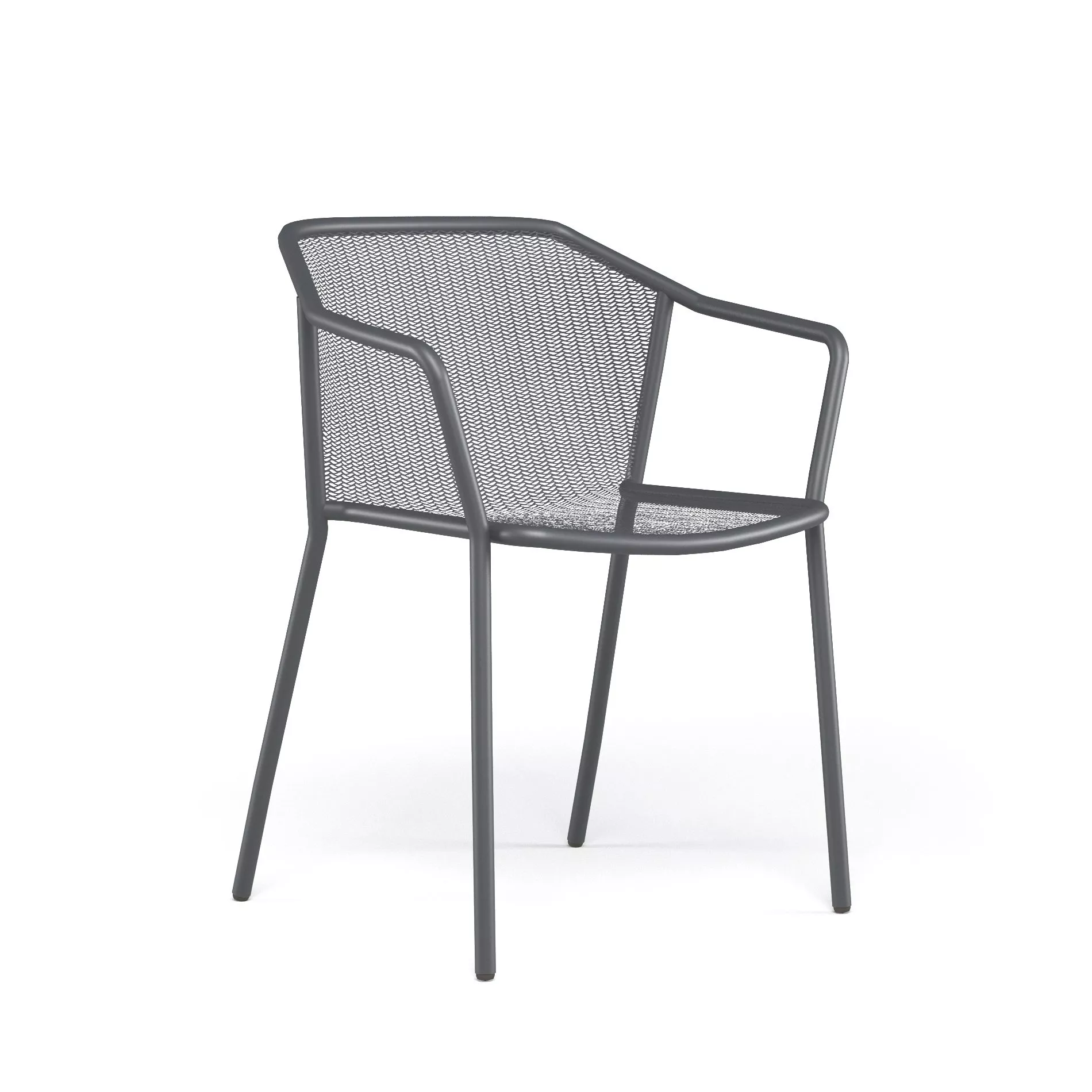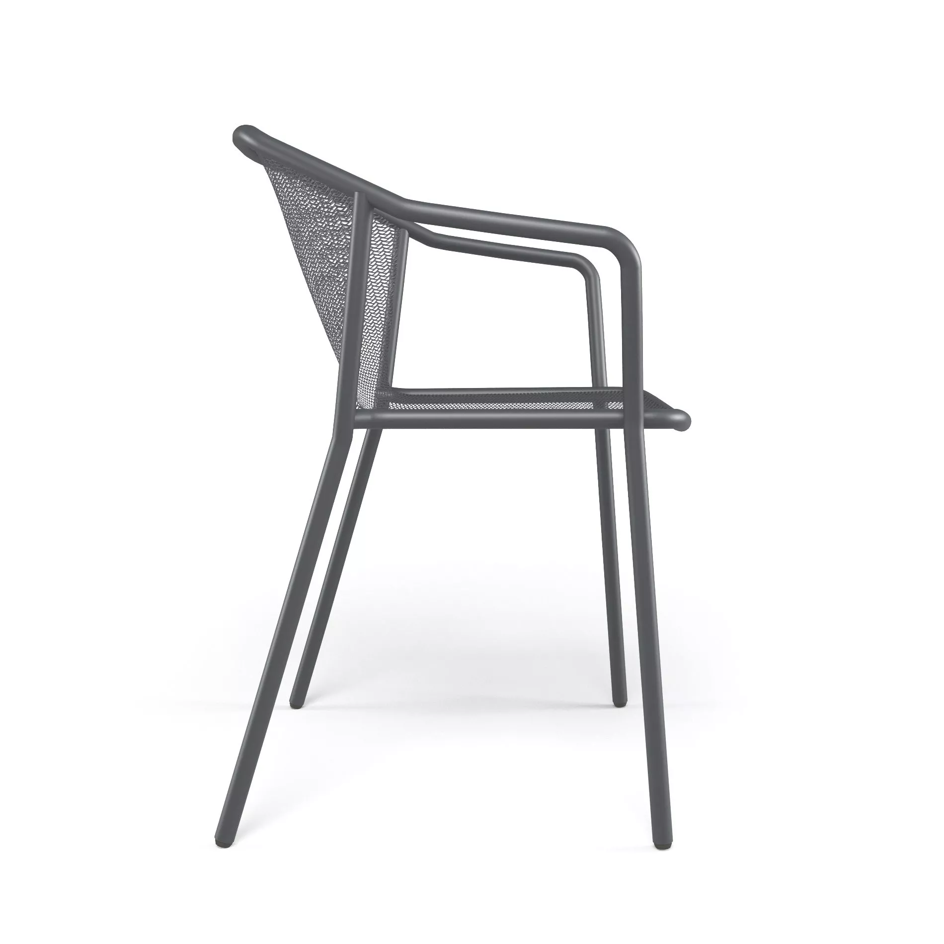 Die beiden Stapelstühle sind ebenfalls aus Stahl gefertigt und passen perfekt zum Tisch. Sitz- und Rückenfläche bestehen aus fein strukturiertem Stahlblech, was ihnen eine wunderbar leichte Ausstrahlung verleiht. Die Stapelfunktion ermöglicht eine flexible Handhabung und erleichtert das Verstauen, wenn die Stühle gerade nicht benötigt werden.