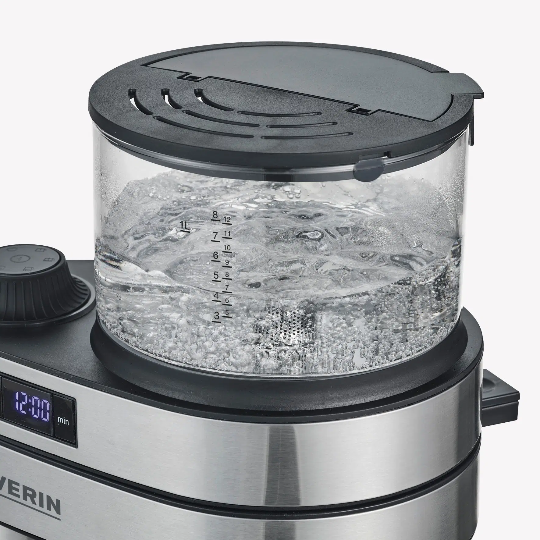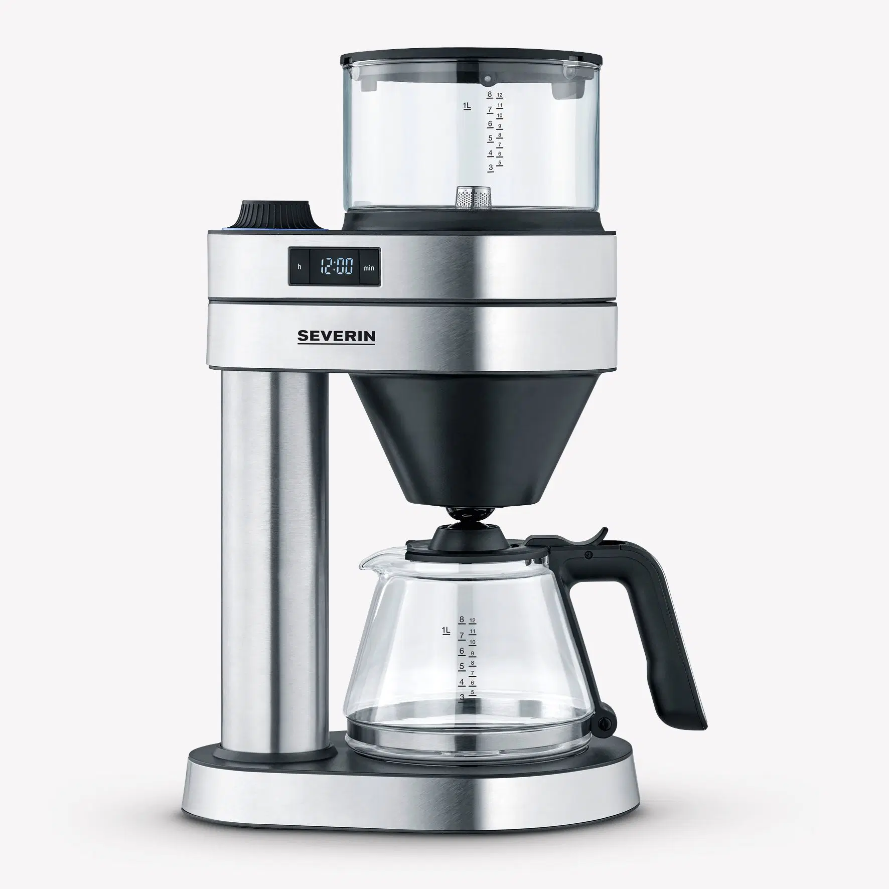 Feines Aroma, intensive Farbe, betörender Duft – mit der Filterkaffeemaschine Caprice KA 5762 mit Glaskanne von SEVERIN bereitest du auf Knopfdruck mehrere Tassen köstlichen Kaffee für die ganze Familie zu. Dank innovativem Schwallbrühverfahren genießt du Kaffee wie schonend von Hand aufgebrüht. Das Schöne: Durch den transparenten Glaswasserbehälter hast du den Brühvorgang genau im Blick. Die Kaffeemaschine ist mit ihrem schlanken Edelstahldesign mit schwarzen Kunststoffelementen aber auch für sich eine Wonne für die Augen.
