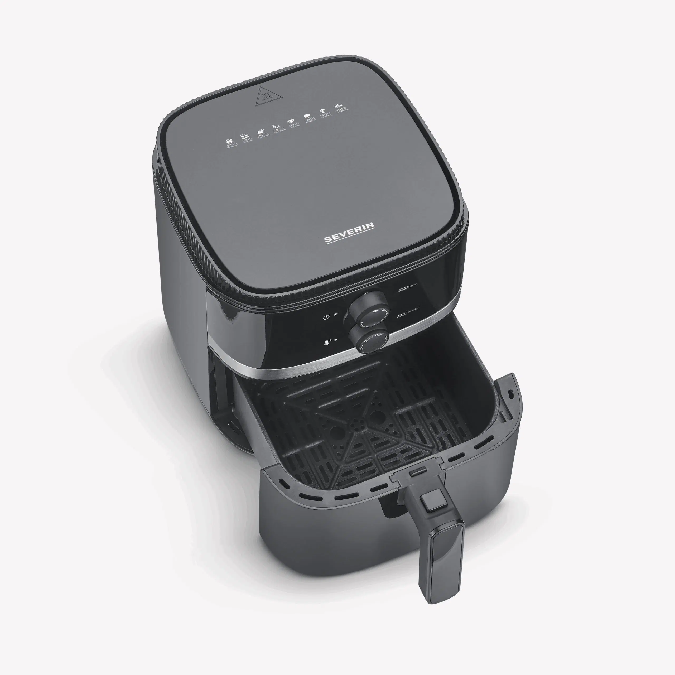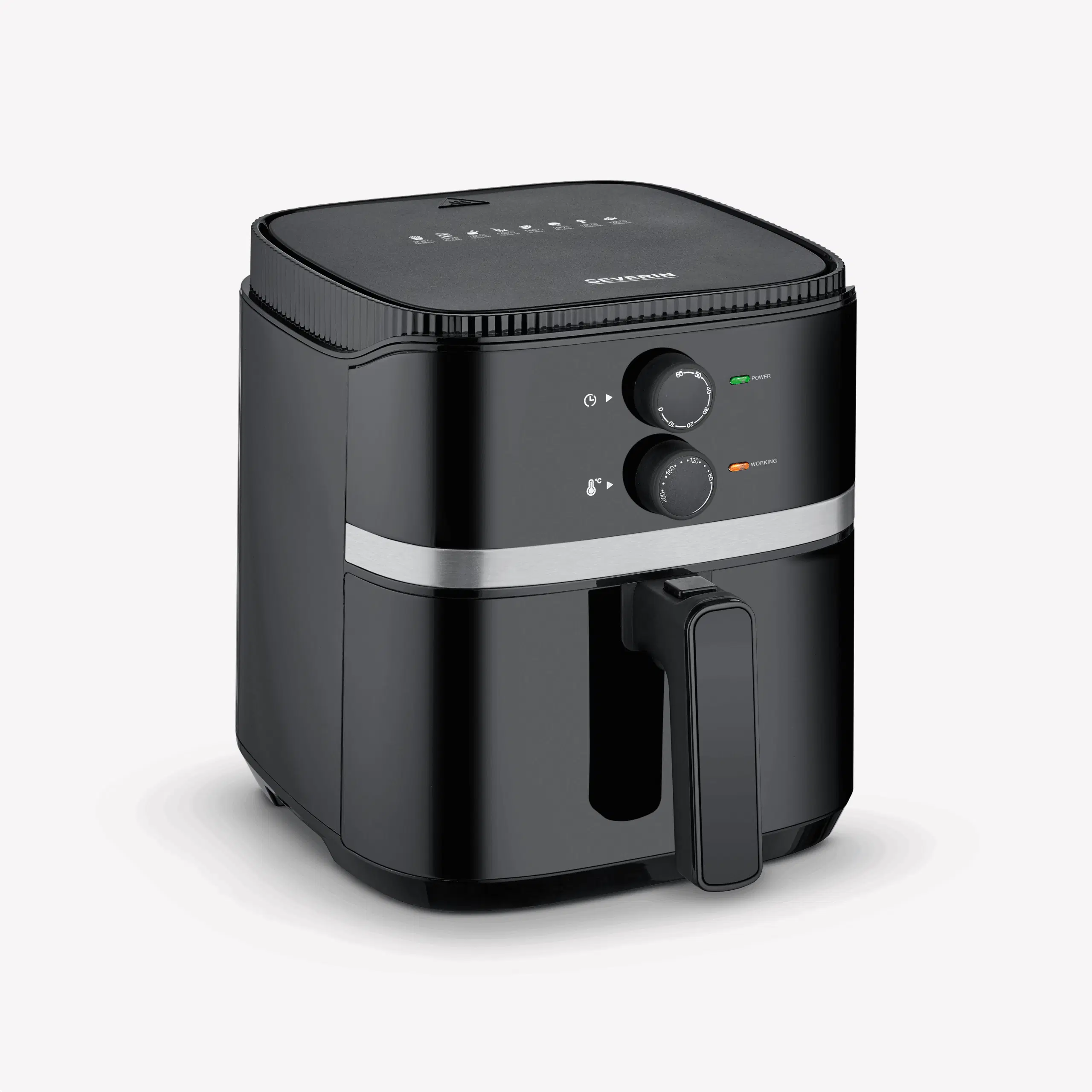 Questa friggitrice ad aria calda è un ottimo tuttofare in cucina. Grazie ai comandi manuali di facile utilizzo, è possibile iniziare a preparare i cibi con estrema rapidità. La temperatura può essere impostata individualmente da 80 a 200 °C e il timer di 60 minuti con segnale acustico vi ricorda quando il cibo è pronto. Grazie al volume della camera di cottura di 5 litri e alla capacità del cestello di frittura di 4,3 litri, è possibile preparare fino a 800 g di patatine.