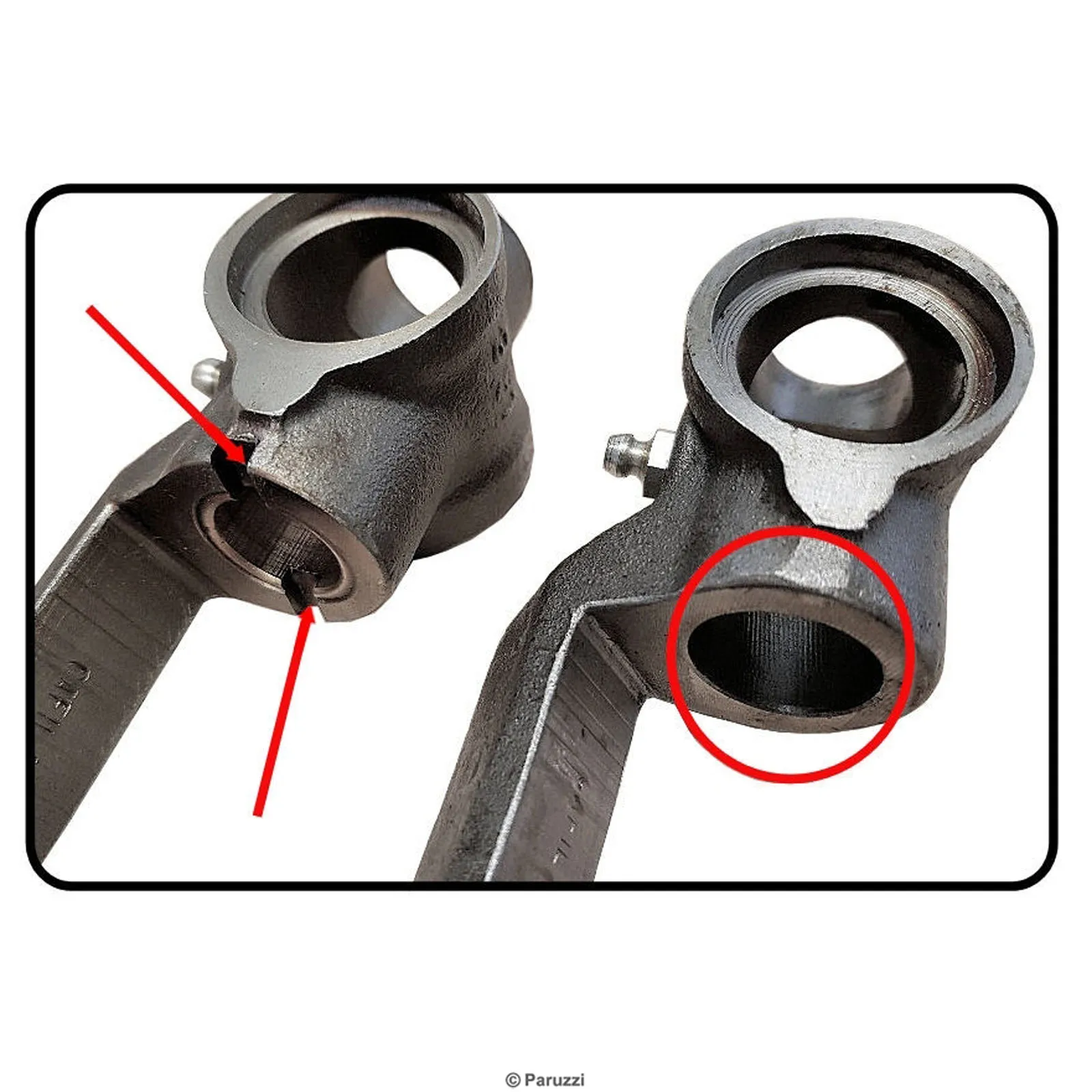 Wenn der Gelenkbolzenträger zu verschlissen ist, ist ein Revision nicht mehr möglich und Sie müssen den Gelenkbolzenträger austauschen. Die meisten Probleme treten mit dem Lenkwinkel auf, der durch die schräge Kante der Halterung begrenzt wird, wenn er verschlissen ist, wird der Lenkwinkel zu groß.
