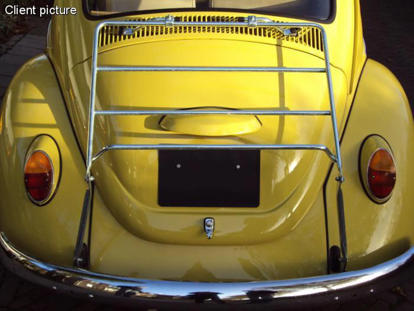 Wenn mehr Gepäckraum benötigt wird, kann ein Volkswagen Käfer oder der Karmann Ghia auch mit einem Gepäckträger auf der Motorhaube ausgestattet werden. Diese Gepäckträger werden zwischen den Kühlschlitzen und beim VW Käfer auch an den Stoßfängerträgern montiert. Beim Karmann Ghia lässt sich die Motorhaube weiterhin öffnen, beim VW Käfer muss man die unteren Befestigungsbeine abschrauben und den Träger nach oben kippen bzw. schieben. Erhältlich mit einem verchromten, verzinkten oder Edelstahlrahmen, ausgestattet mit Holz- oder Metallbalken. Alle Gepäckträger werden inklusive Montagematerial geliefert.