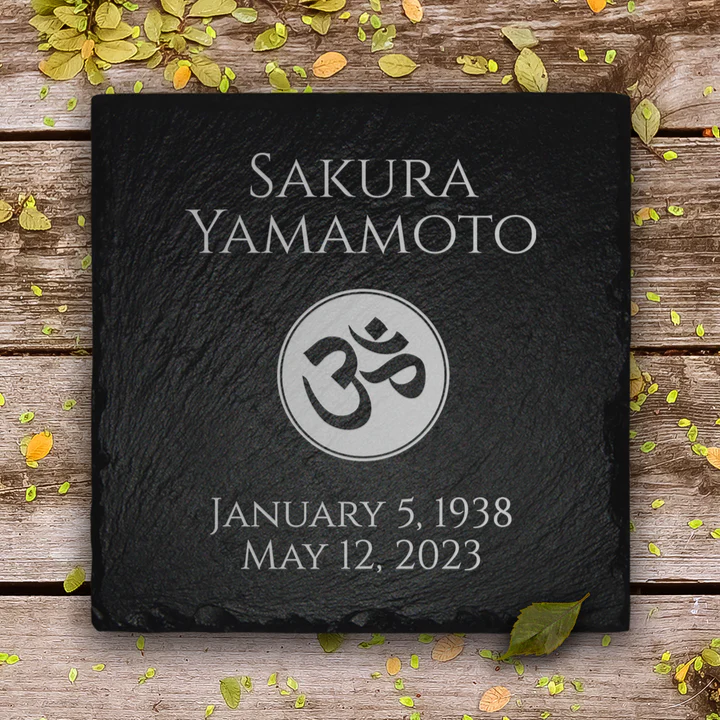 Ein Grab- & Gedenkstein, der mit einer OM Gravur und Inschrift in verschiedenen Größen (15×15 – 30×30 cm) aus Natur-Schiefer gefertigt ist. Dieser Stein kann sowohl als Liege- oder Stellplatte am Grab, an der Gedenkstätte oder zu Hause platziert werden, um ein liebevolles Gedenken und Erinnern zu ermöglichen.