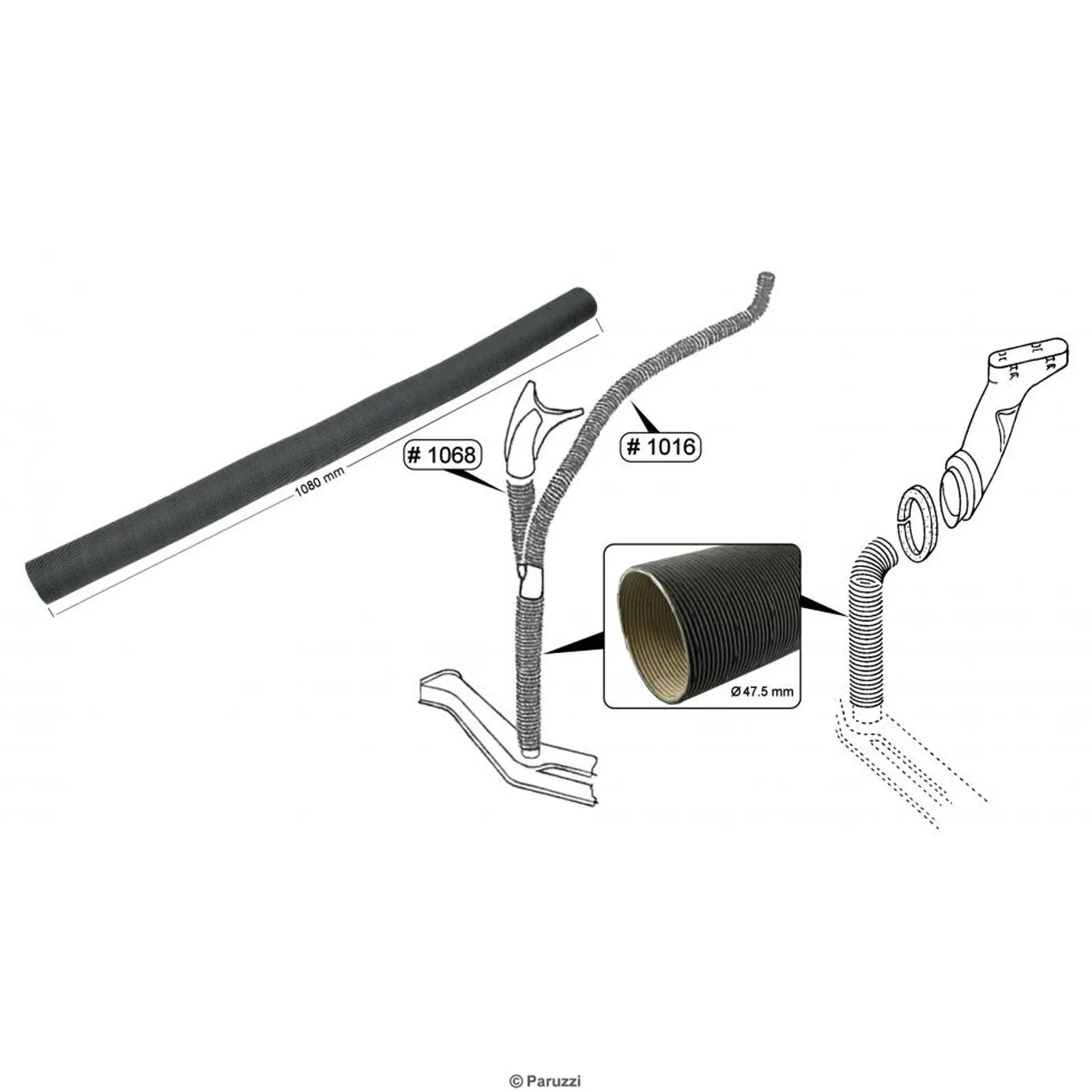 Es handelt sich um einen PAP-Schlauch (Papier/Aluminium/Papier), wie ihn Volkswagen im Original verwendet. Dank der inneren und äußeren Papierhülle wird die warme Luft länger gehalten (isoliert). Bei einem reinen Aluminiumschlauch würde die warme Luft aus dem Rohr entweichen. Da das gesamte Heizsystem auf