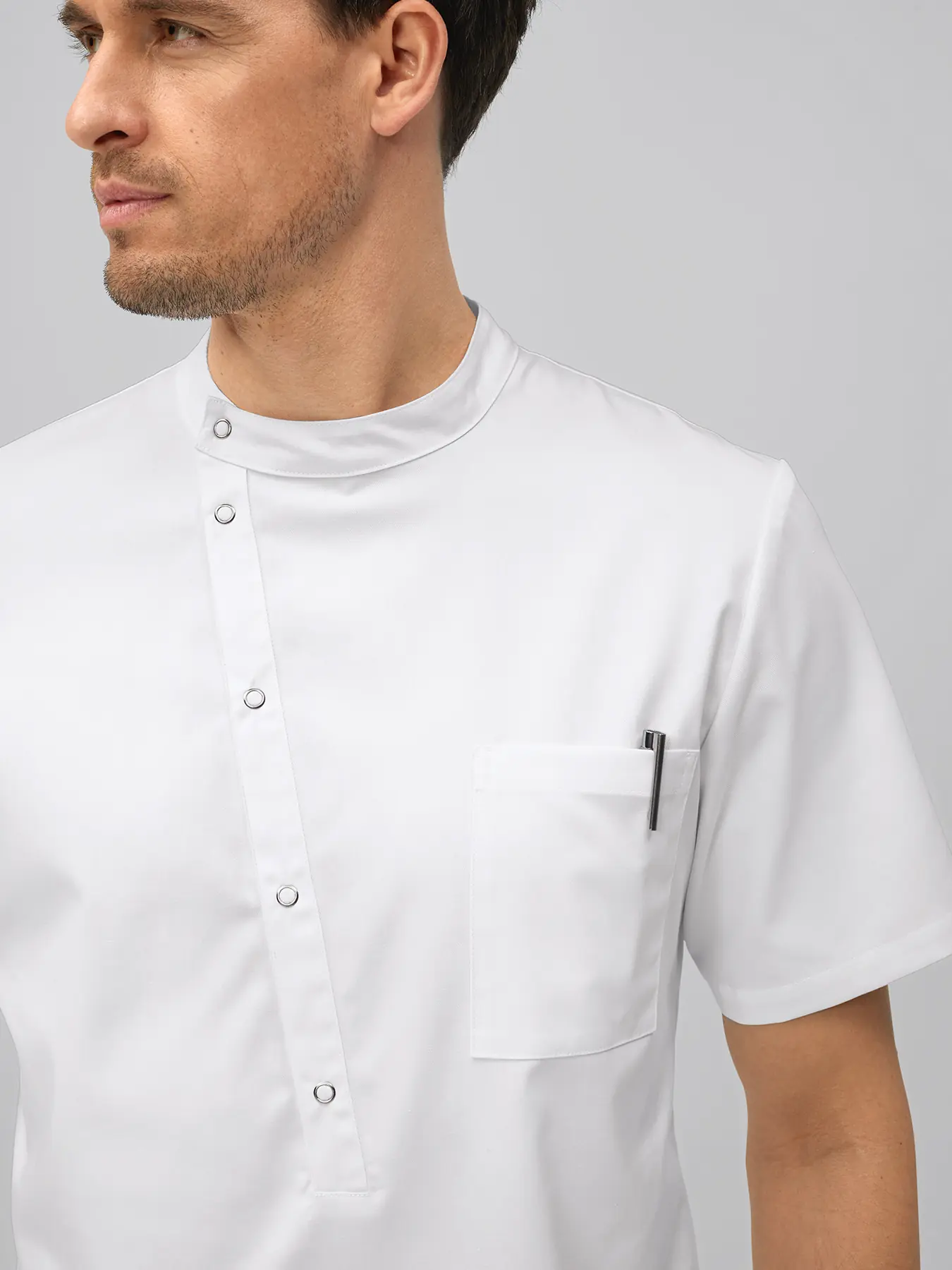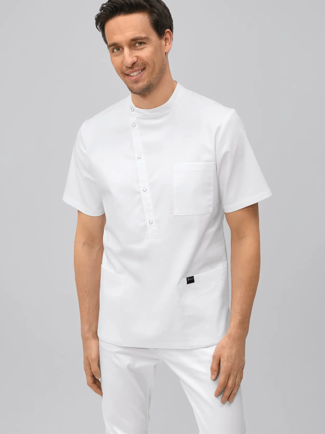 Moderner Herrenkasack, regular fit mit Stehkragen und asymmetrischer Druckknopfleiste. 1 Brusttasche, 2 große Eingrifftaschen, bequeme Seitenschlitze, Rückenlänge Gr. M ca. 73 cm. Weiß = 65% Polyester/35% Baumwolle, 195 g/m2, Farben = 50% Polyester/50% Baumwolle, 150 g/m2, 95°-Wäsche, trocknergeeignet.