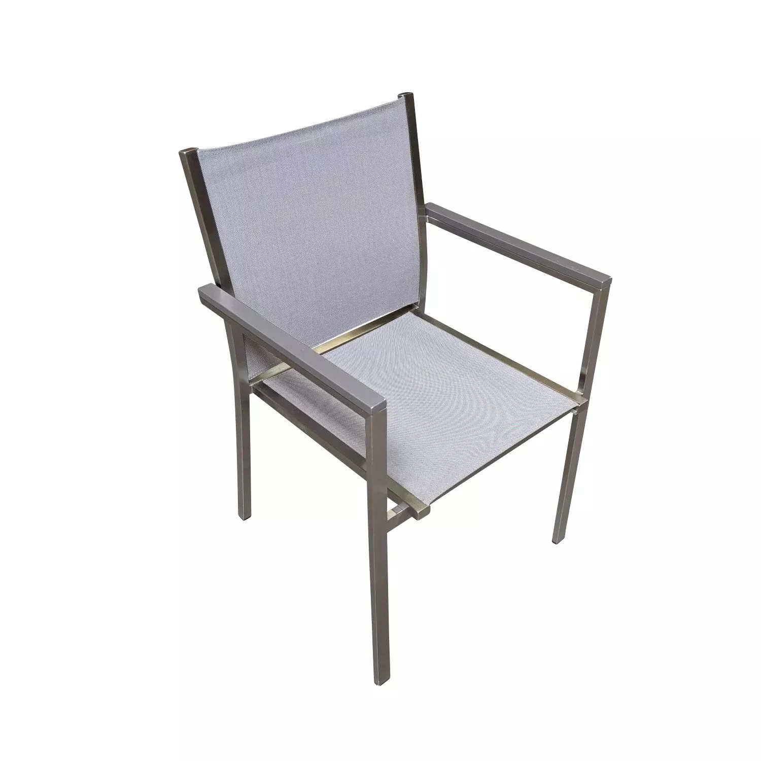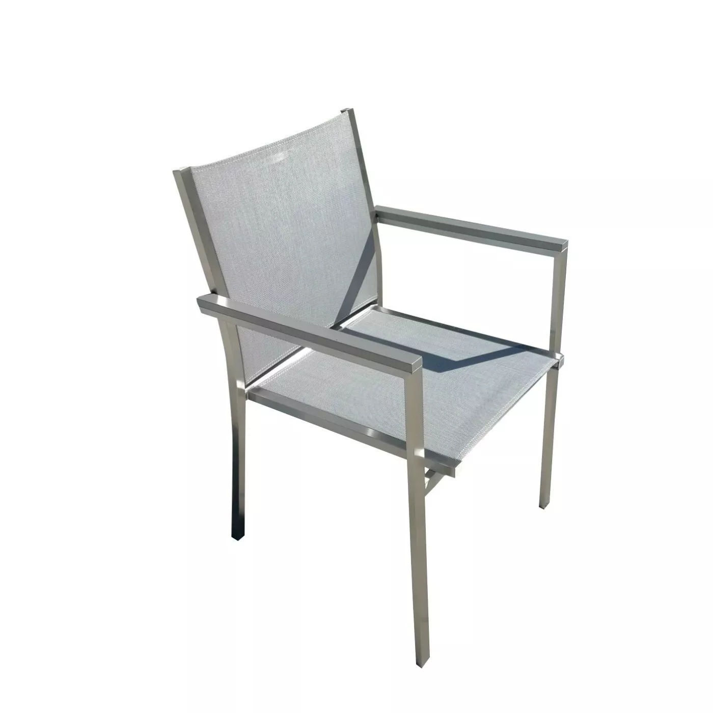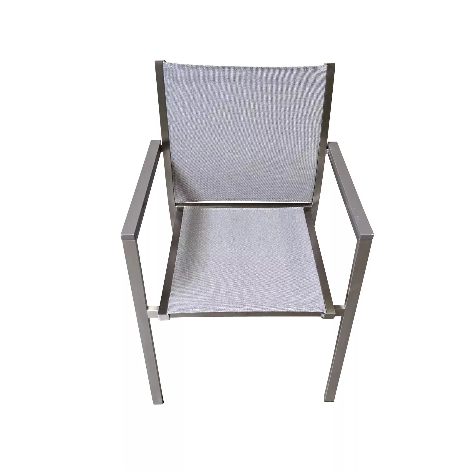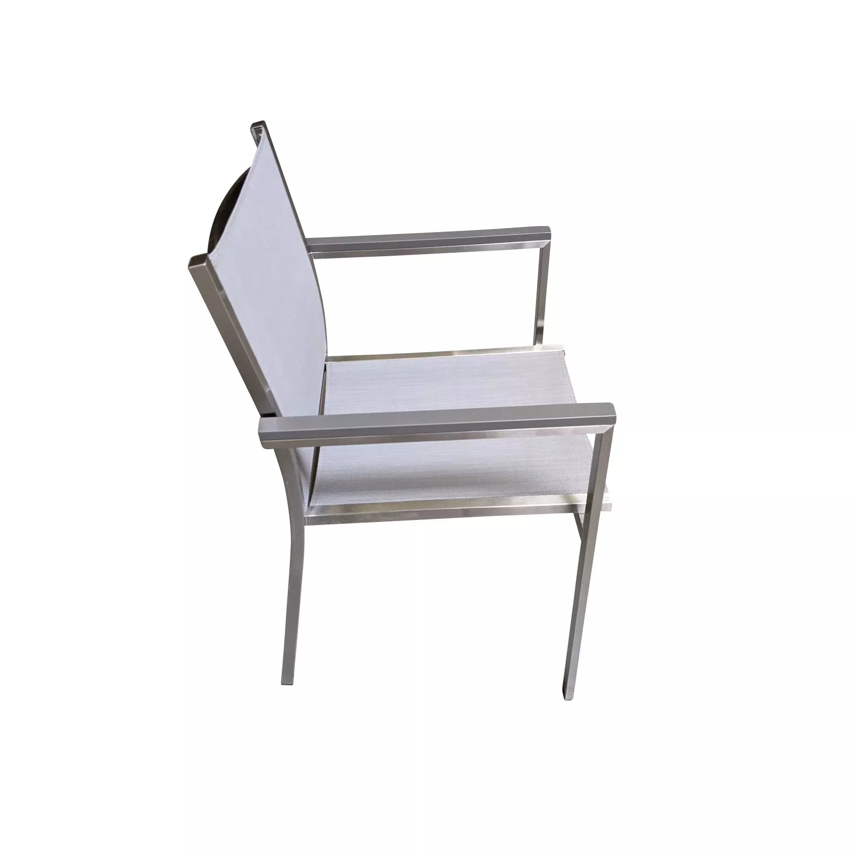 besitzt ein Gestell aus Edelstahl, das sehr stabil und wetterbeständig ist. Hierzu wurde robustes, strapazierfähiges Textilgewebe als Bespannung kombiniert, damit der Sessel den Sommer über gut im Freien stehen bleiben kann. Das angenehme und atmungsaktive Textilgewebe sorgt für hohen Sitzkomfort. Die Armlehnen aus Aluminium geben dem Gartenstuhl den letzten Schliff und sind auch optimal für den Außenbereich geeignet.