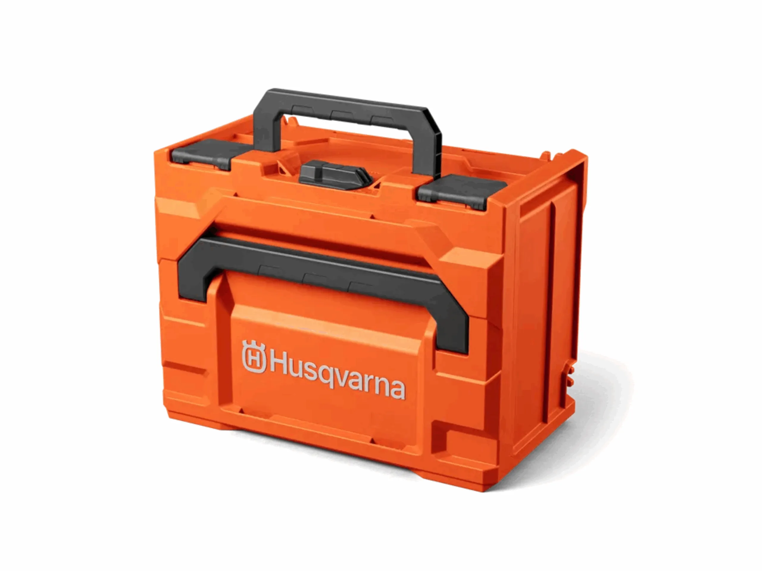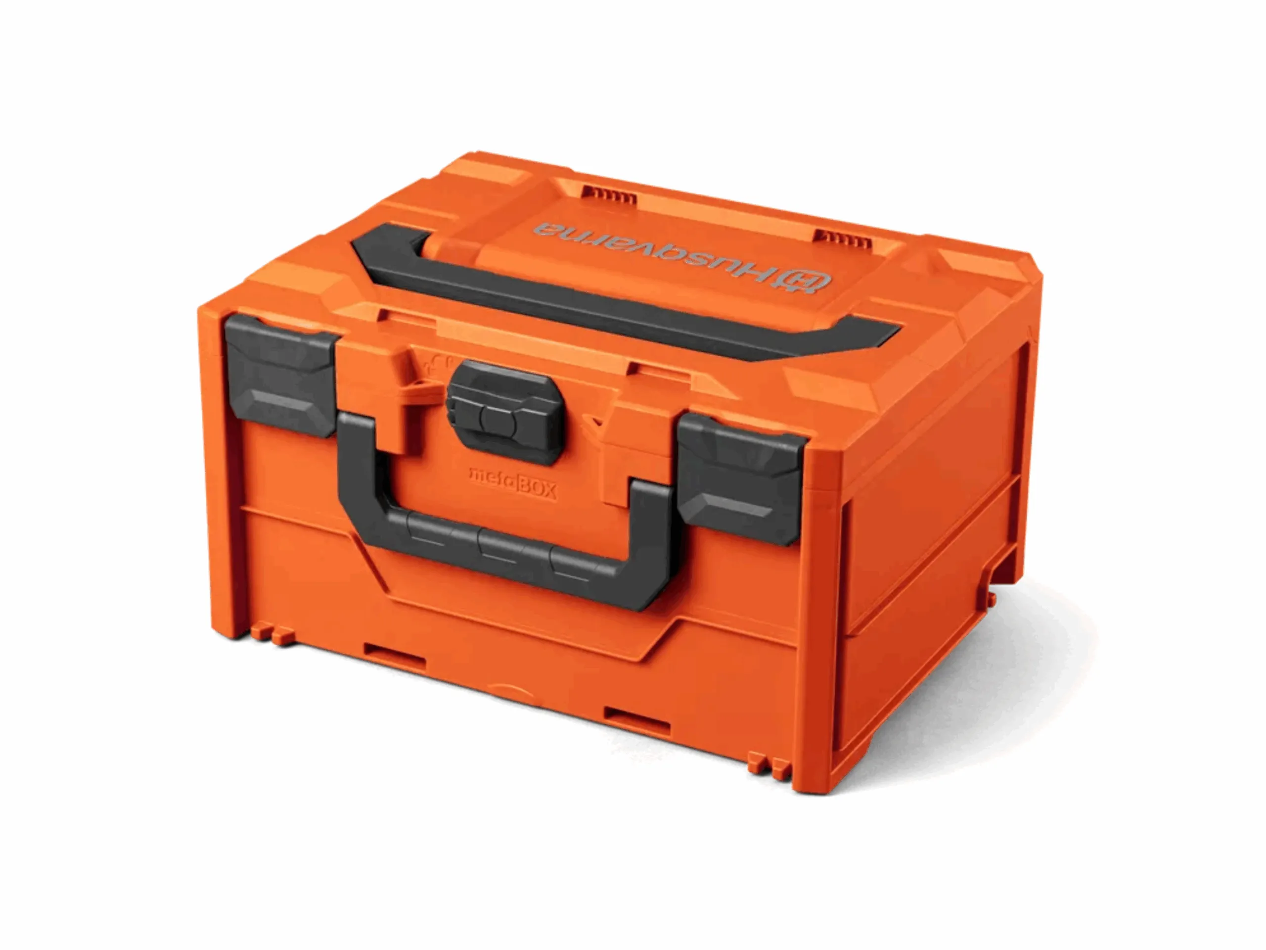 Husqvarna Akku-Box M ist eine robuste und handliche Box für den Transport und die Lagerung von bis zu sechs 36V-Li-Ion-Akkus der Größe M*.
