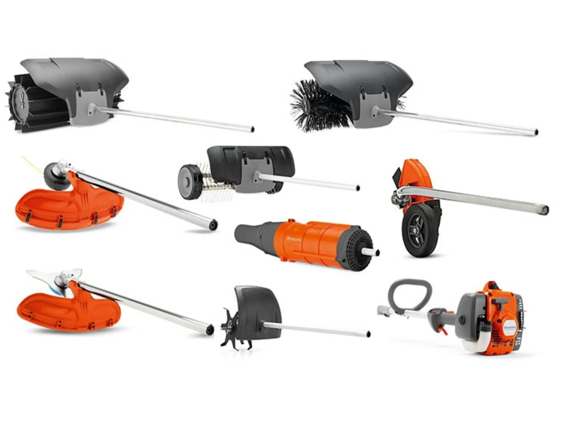 Aufsätze wie Hochentaster, J-Set, Blasgerät, Heckenscheren, Motorhacke, Kantenschneider und Kehrwalze sind als Zubehör erhältlich.