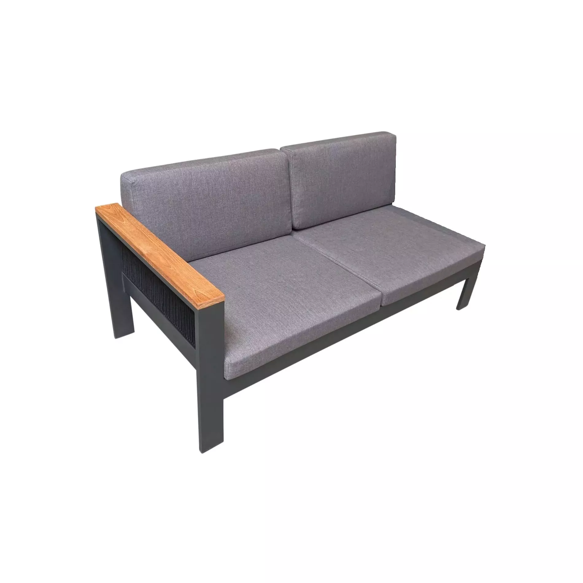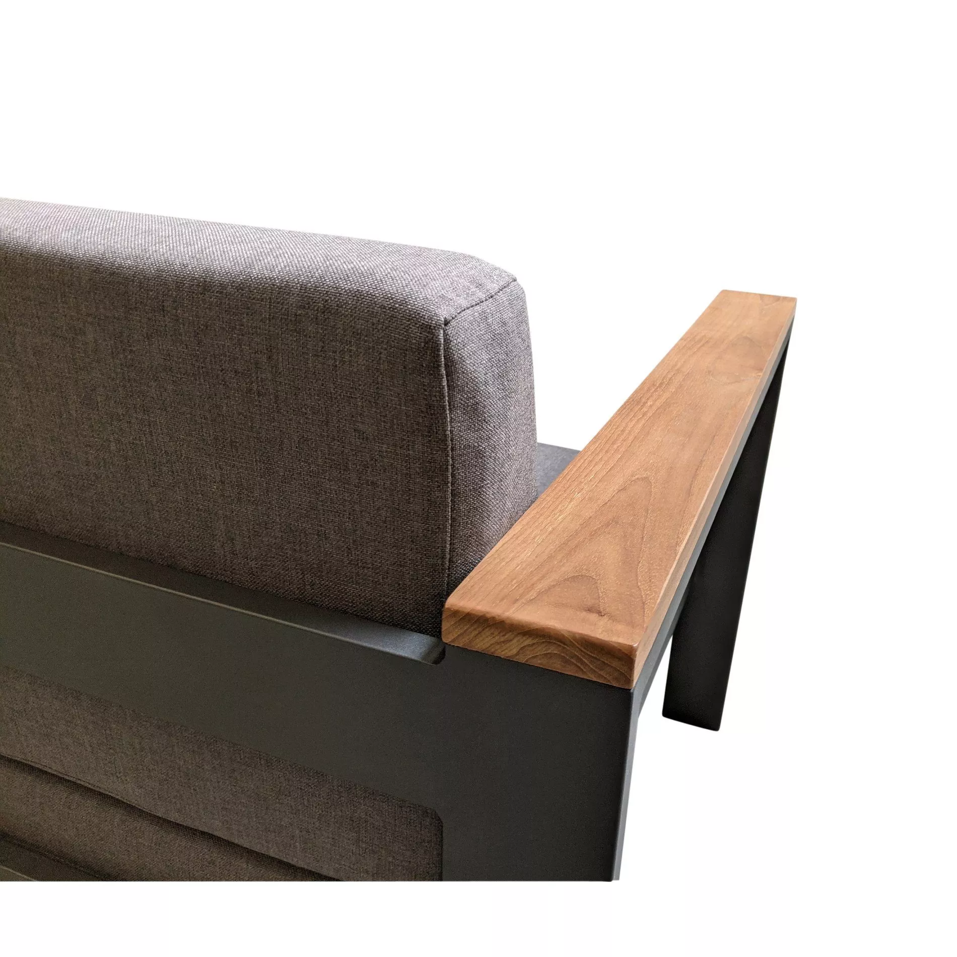 verfügt über ein Gestell aus pulverbeschichtetem Aluminium in Eisengrau. Aluminium besitzt eine hohe Stabilität und Robustheit. Zudem ist Aluminium ein Leichtgewicht unter den Metallen. Gartenmöbel aus Aluminium sind handlich und lassen sich, dank ihres geringen Gewichts, ohne großen Kraftaufwand umstellen. Die Sitzflächenbasis besteht aus Aluminiumlatten. Die Bespannung des Seitenteils ist aus schwarzem Rope (Polypropylen) gefertigt. Rope ist wetterfest und bleibt dauerhaft in Form. Es verfügt über eine sehr gute Lichtechtheit und benötigt keine besondere Pflege. Die Armlehne besitzt eine Auflage aus Teakholz.
