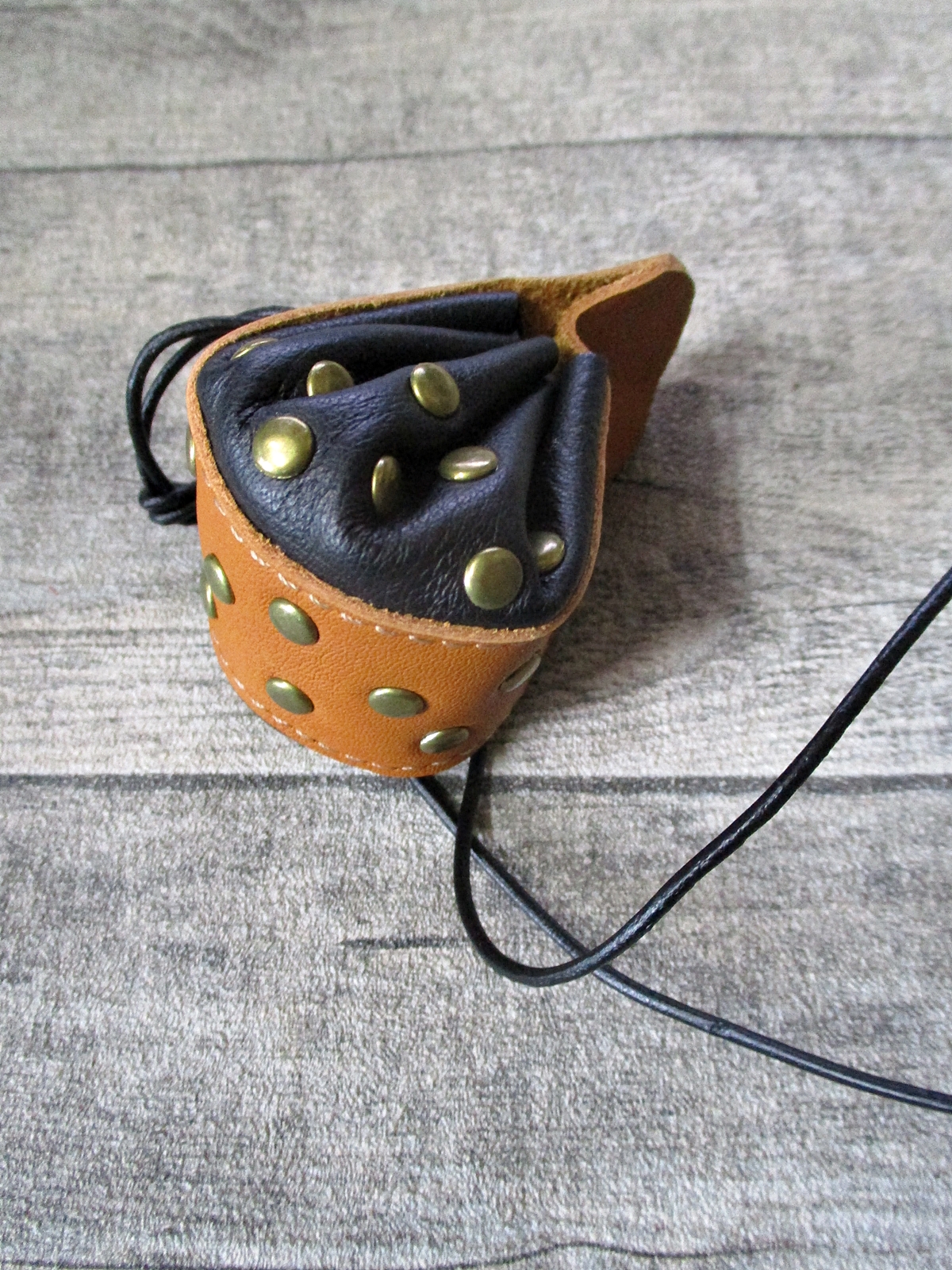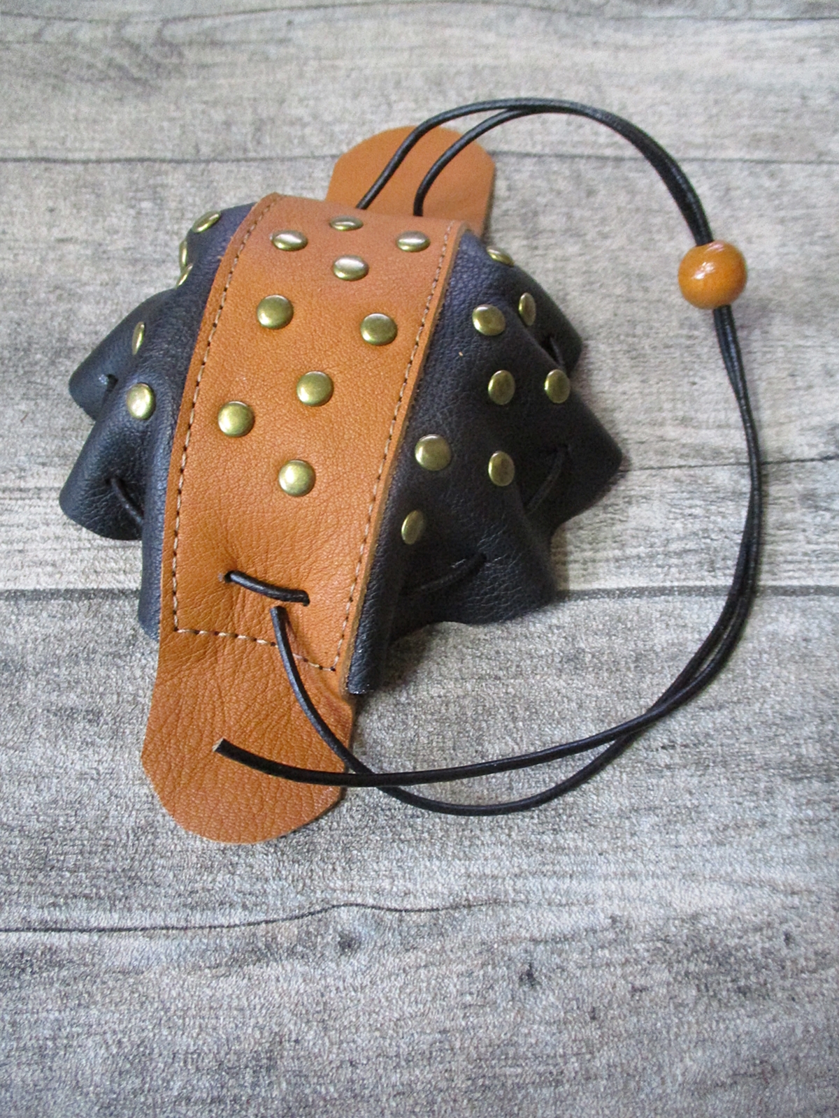 Der Lederbeutel der Marke MONDSPINNE® besteht aus schwarzem und cognacfarbenem Leder.