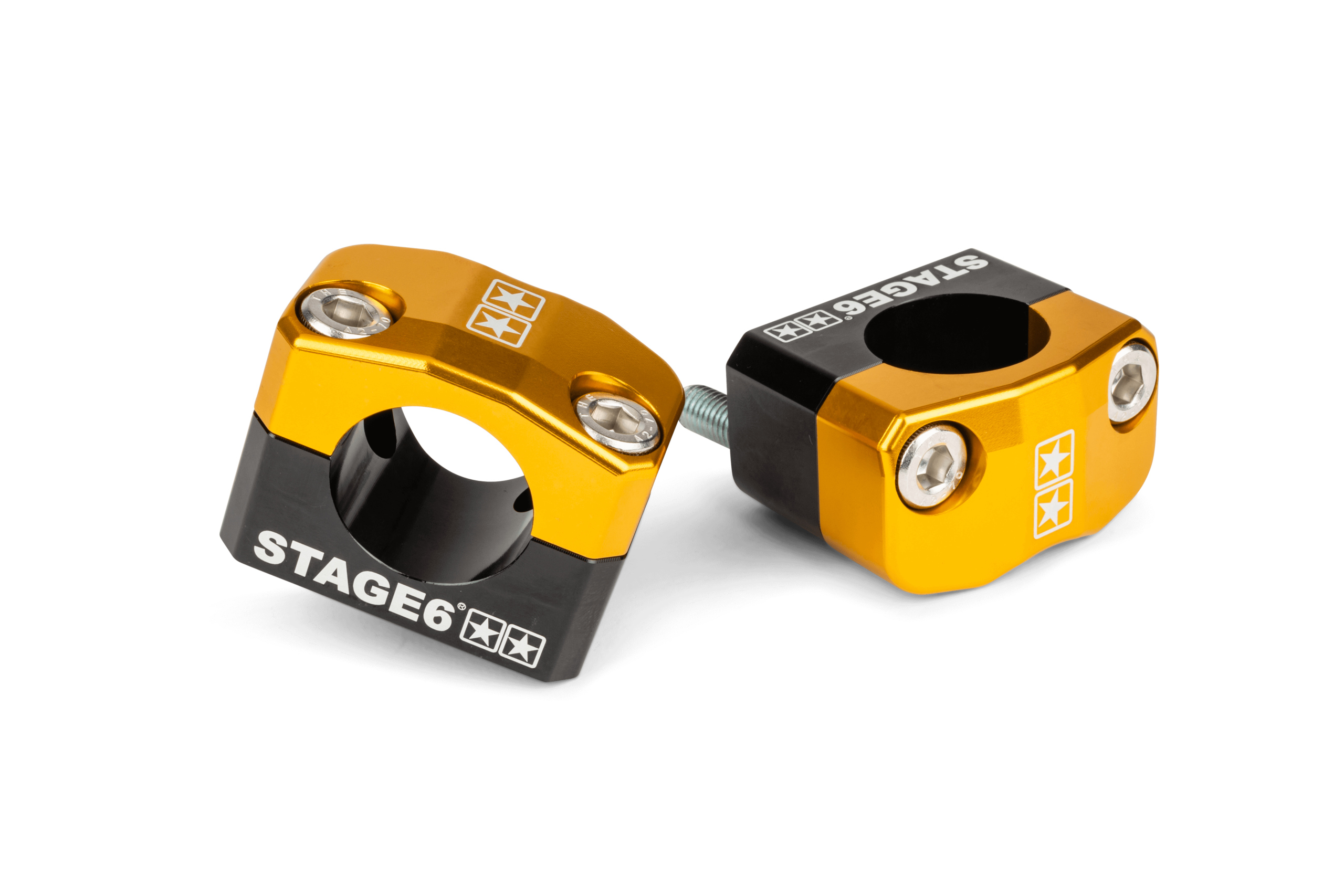 Die Lenkerklemmen sind CNC-gefräst und farbig eloxiert, mit gelasertem Logo auf der Oberseite (2 Sterne) und an den Seiten (Stage6 Logo). Erhältlich in mehreren Farben.