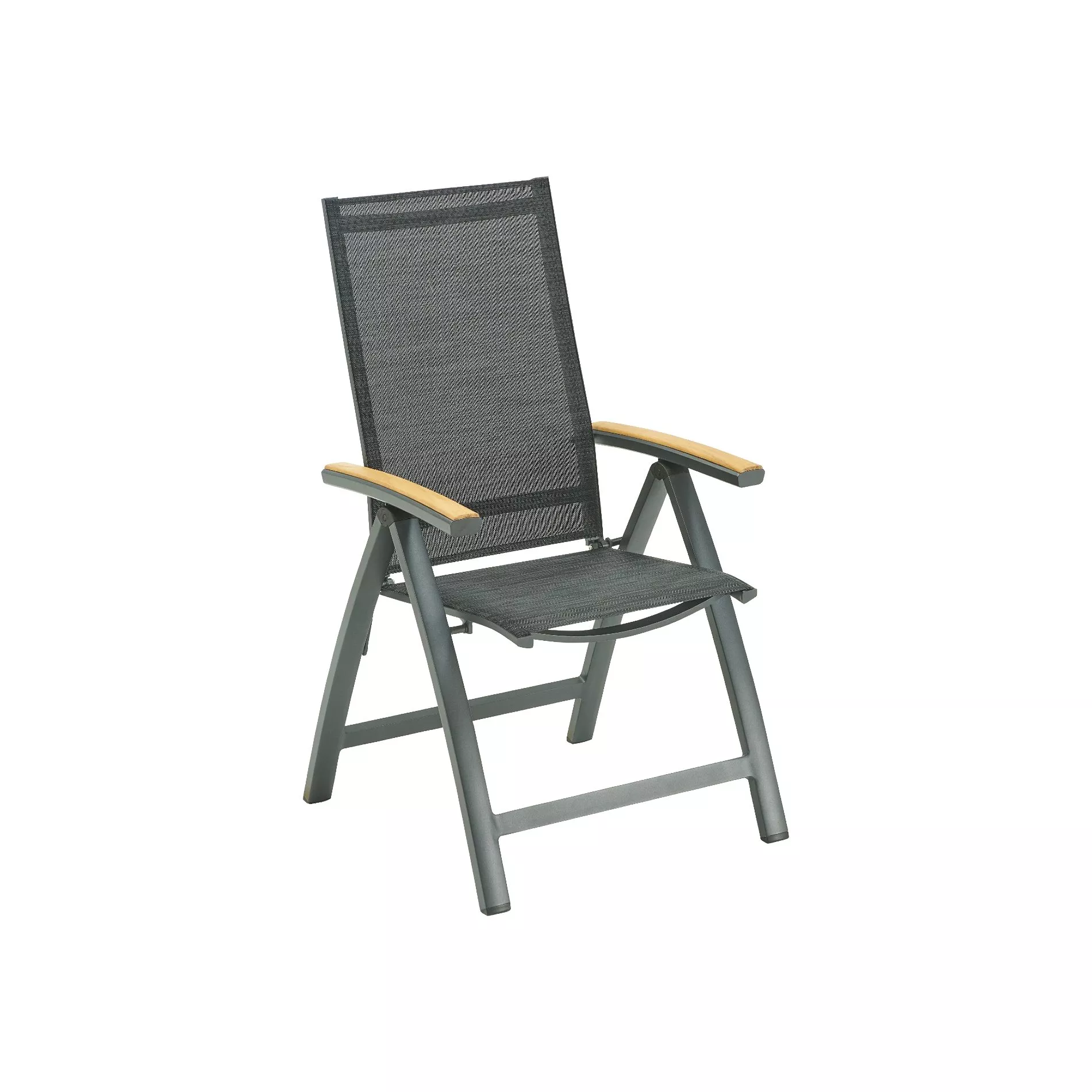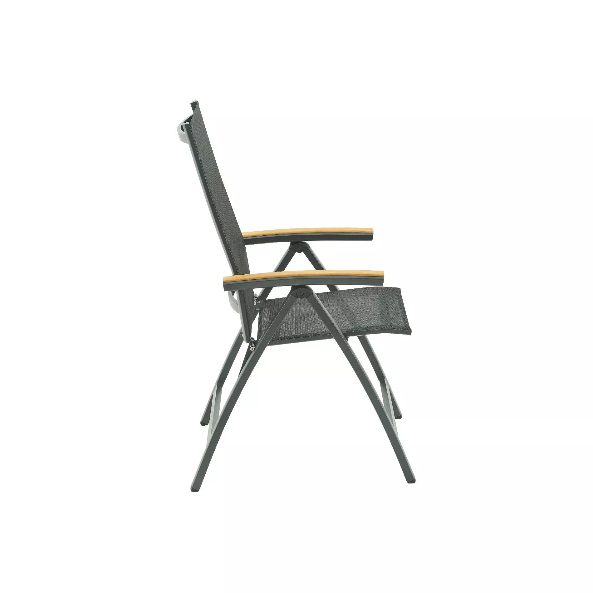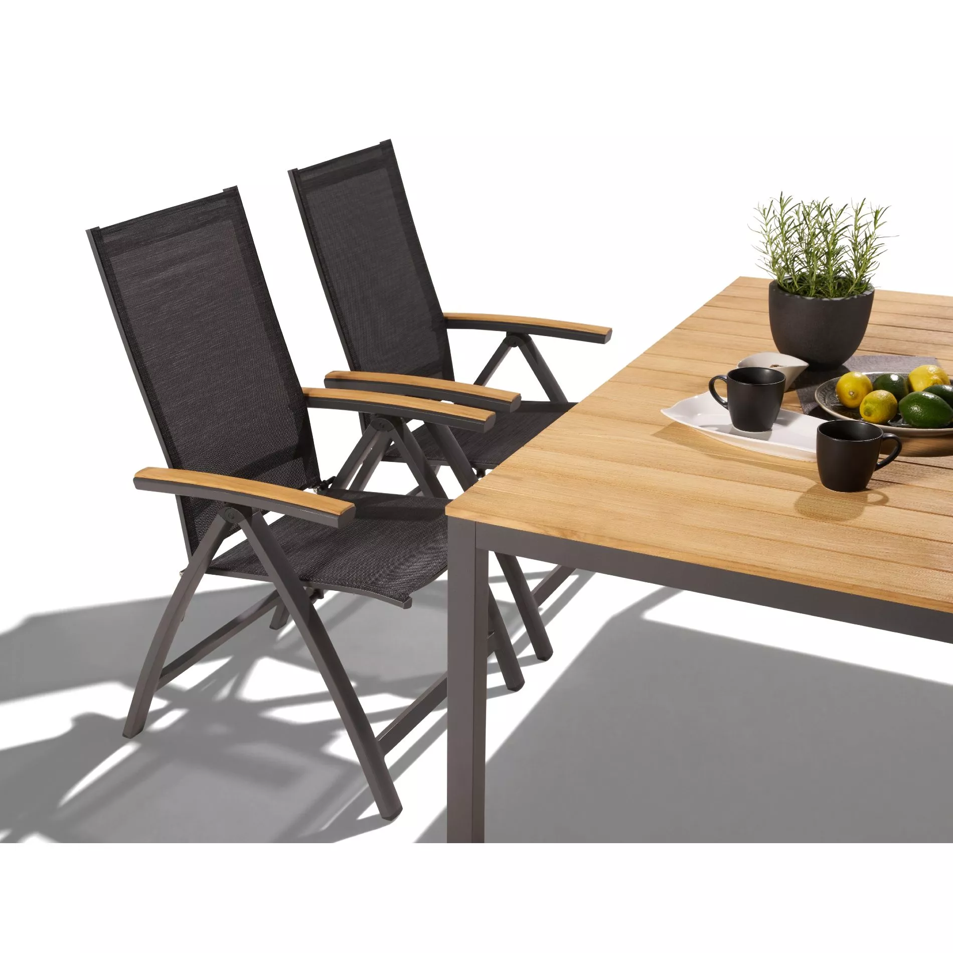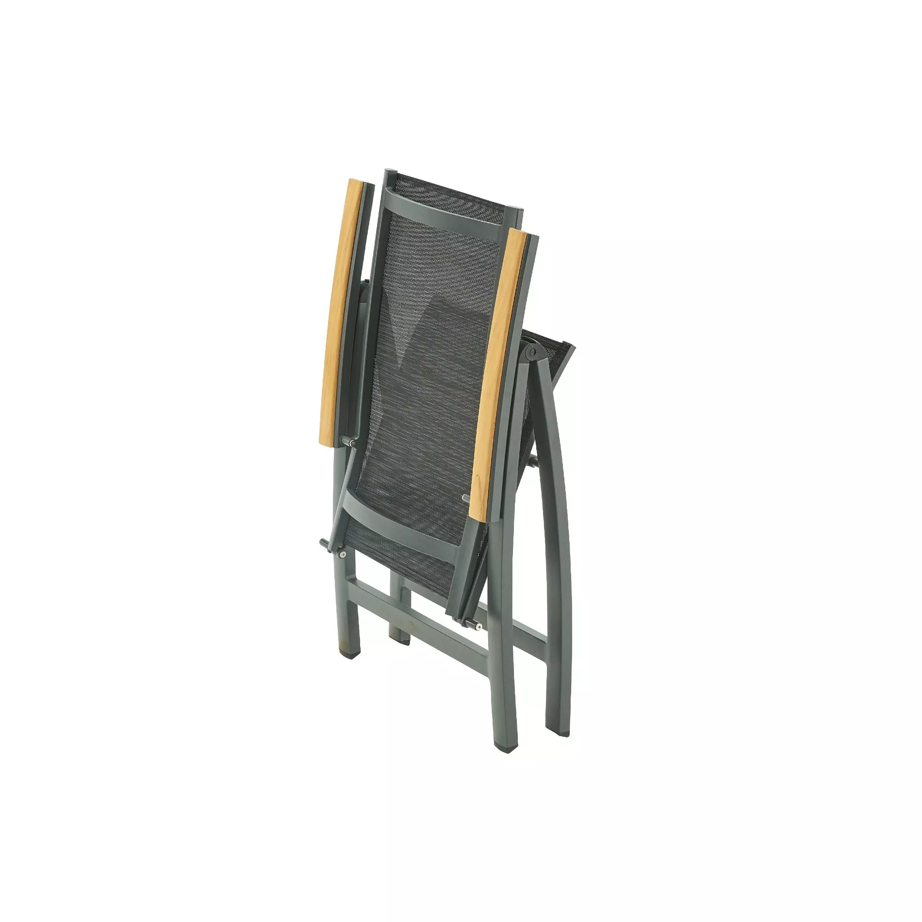 Die Stühle bieten dank Sitz- und Rückenflächen aus strapazierfähigem, anthrazitfarbenem Textilgewebe hohen Komfort und Langlebigkeit. Die Armlehnen aus Teakholz setzen warme, natürliche Akzente und sind gleichzeitig witterungsbeständig – eine gelungene Verbindung von Funktionalität und Ästhetik.