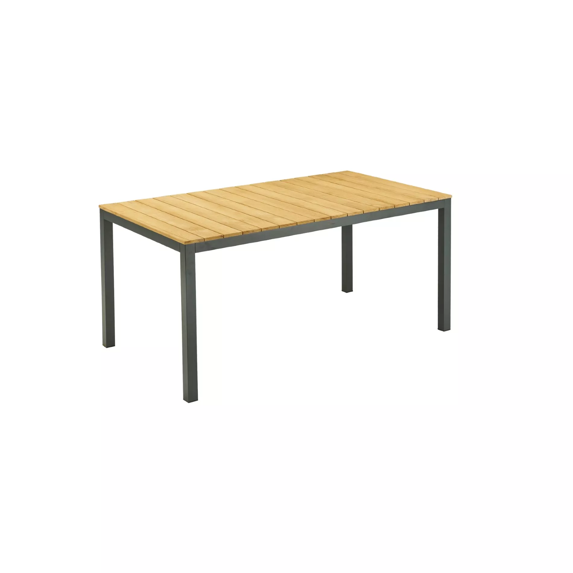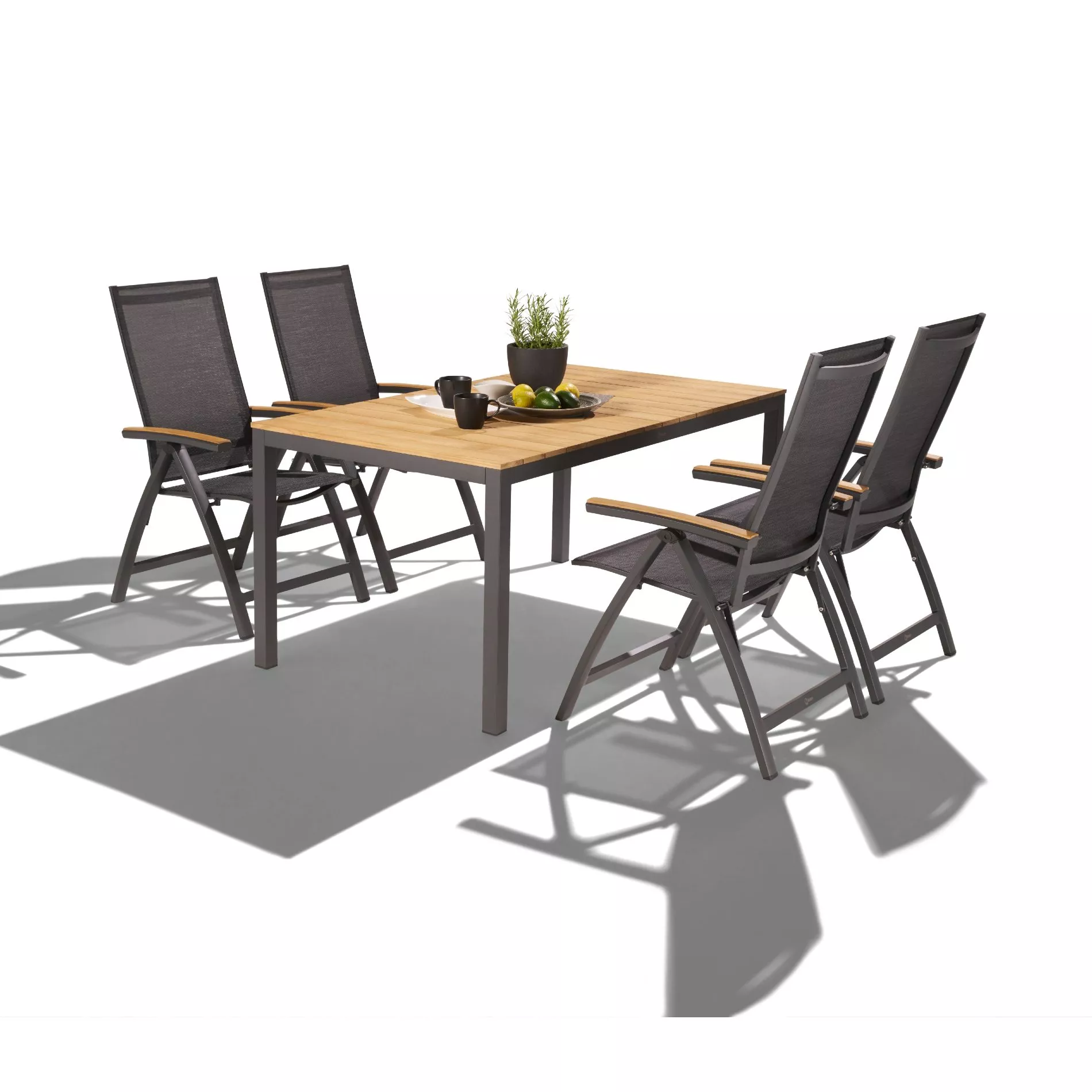 Das Set beeindruckt mit Gestellen aus robustem Aluminium, das durch seine Stabilität und Wetterbeständigkeit überzeugt. Eine anthrazitfarbene Pulverbeschichtung schützt die Oberfläche zuverlässig vor Korrosion und verleiht den Möbeln eine moderne, zeitlose Ausstrahlung. Die Tischplatte besteht aus Teakholz, das durch seine Strapazierfähigkeit, Langlebigkeit und ansprechende Optik besticht. Dank seiner natürlichen Resistenz gegenüber Feuchtigkeit und Schädlingen eignet sich Teakholz hervorragend für den Außenbereich. Die einzelnen Holzleisten verleihen dem Tisch eine warme, einladende Note. Das Holz stammt aus kontrolliertem Plantagenanbau.