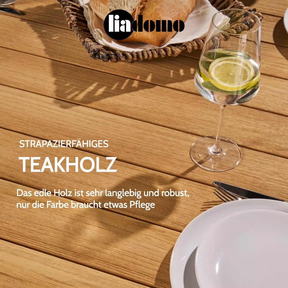 Das Gartenmöbel-Set “Scalea/Ricadi” von Liadomo umfasst fünf hochwertige Outdoormöbel und ist perfekt für den Einsatz im Außenbereich geeignet. Es besteht aus einem stabilen Aluminiumtisch mit einer eleganten Teakholz-Tischplatte im Format 160 × 90 cm sowie vier komfortablen Klappsesseln. Die Tischplatte überzeugt durch ihre ansprechende Gestaltung aus einzelnen Holzleisten. Die Sitz- und Rückenflächen der Sessel bestehen aus strapazierfähigem Textilgewebe, das sowohl wetterfest als auch bequem ist. Mit diesem stilvollen Set verwandeln Sie Ihre Terrasse oder Ihren Garten in eine einladende Oase der Entspannung, ideal für gemeinsame Stunden mit Familie und Freunden.