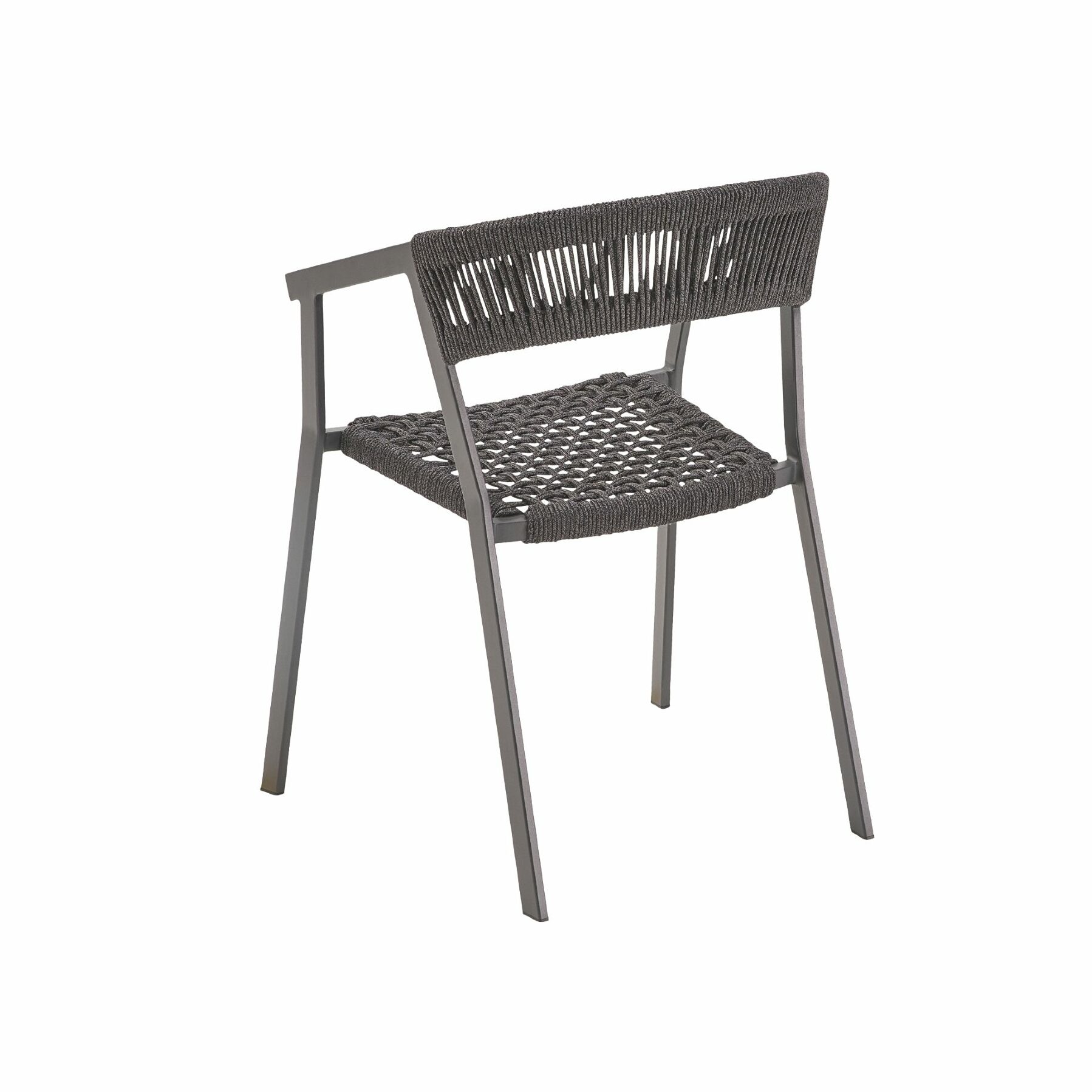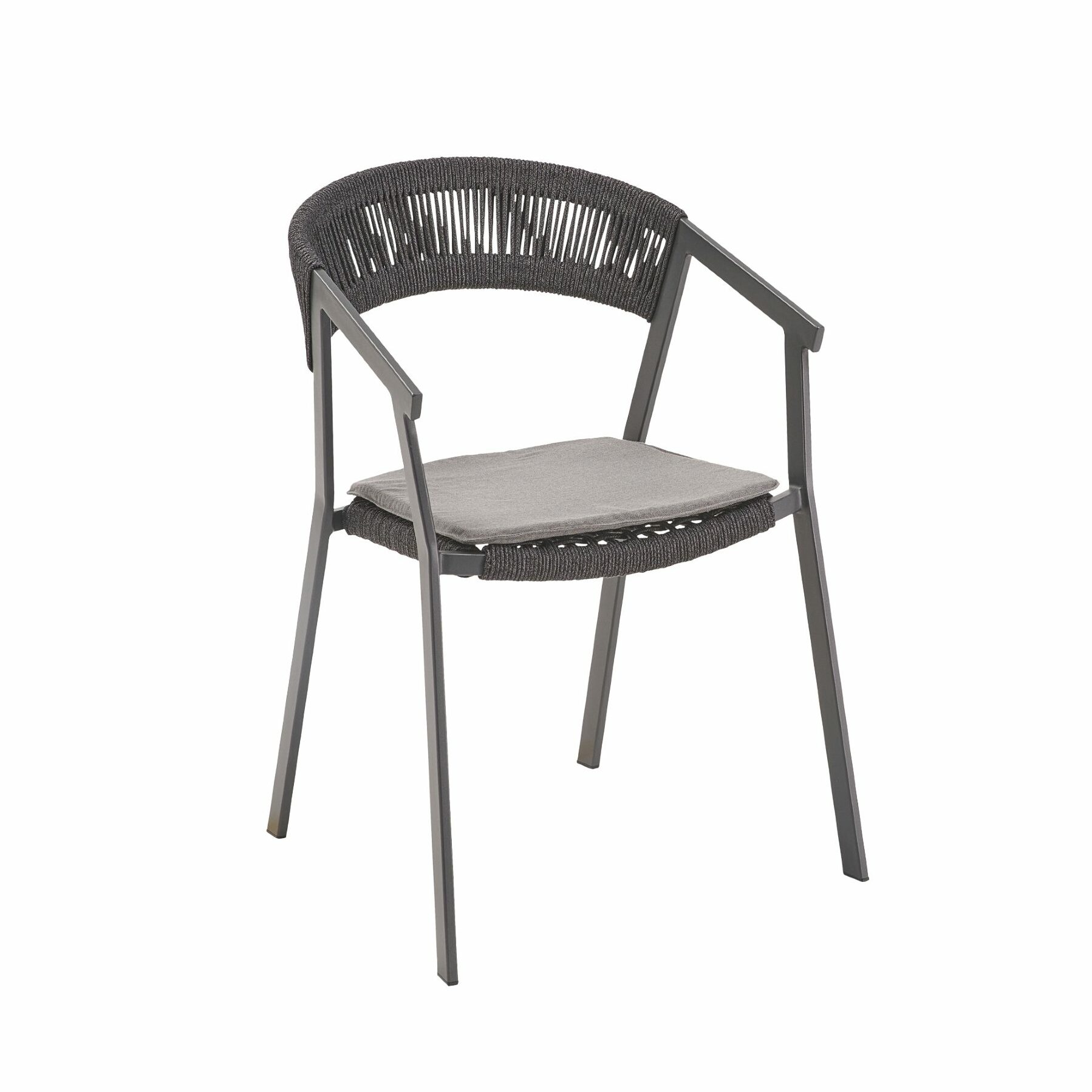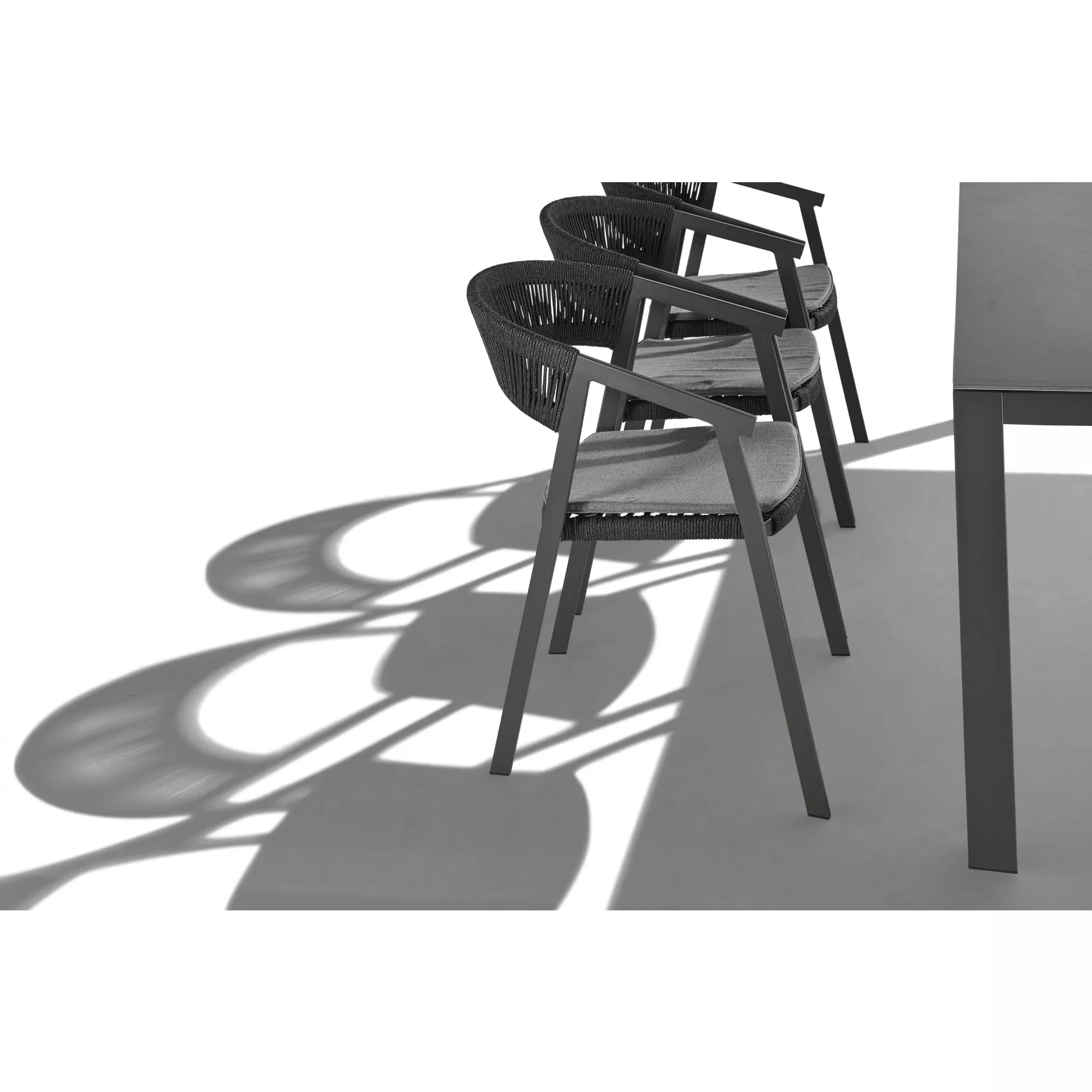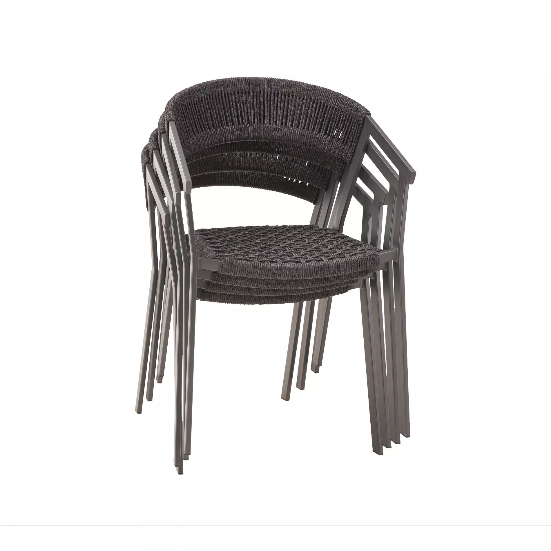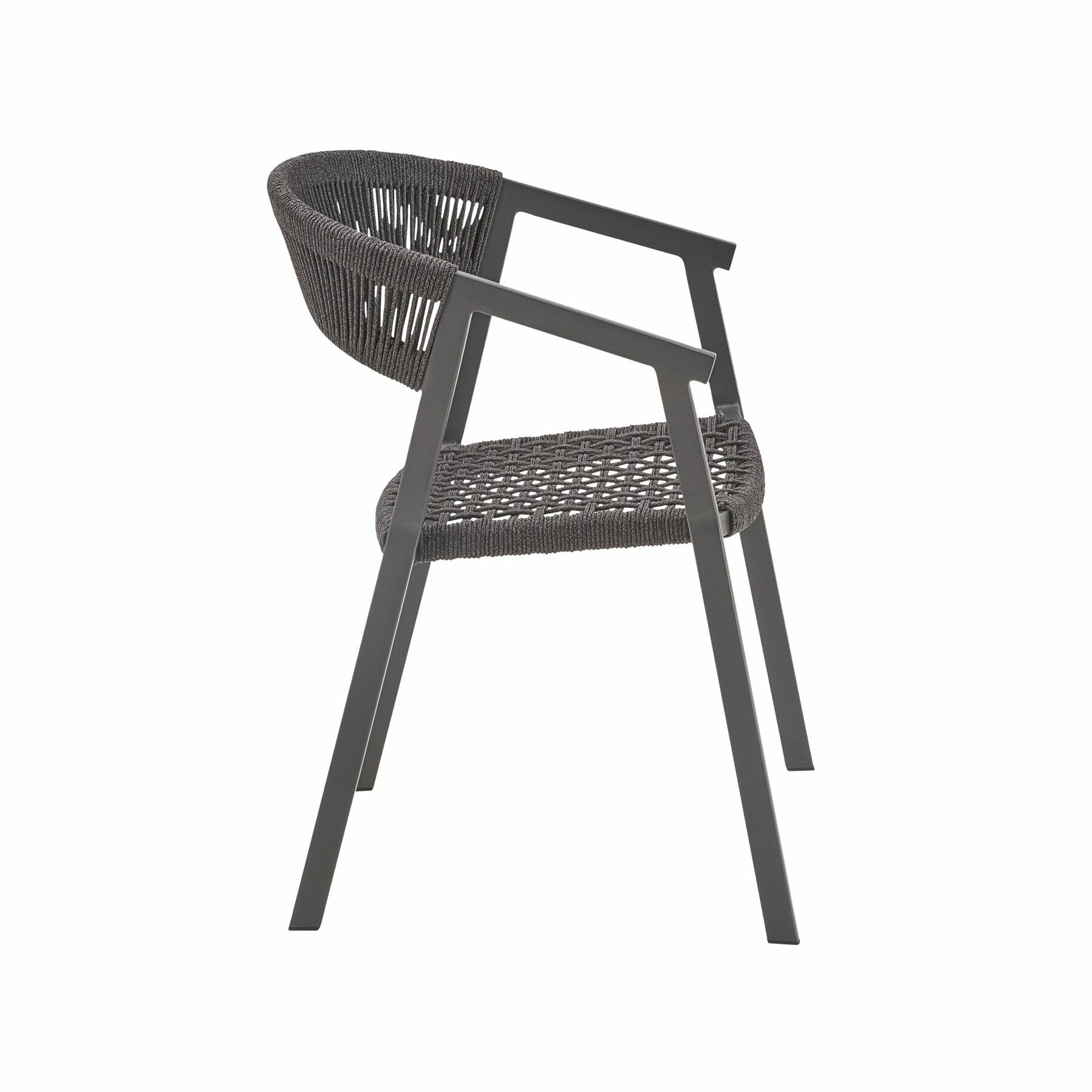 Das leichte, aber extrem robuste Aluminium-Gestell ermöglicht ein einfaches Verrücken und platzsparendes Stapeln, wenn der Stuhl nicht benötigt wird. Dank seiner Korrosionsbeständigkeit ist das Material perfekt für den Outdoor-Einsatz. Die Pulverbeschichtung in Anthrazit harmoniert schön mit der Rope-Bespannung.