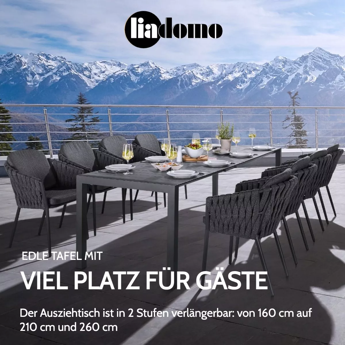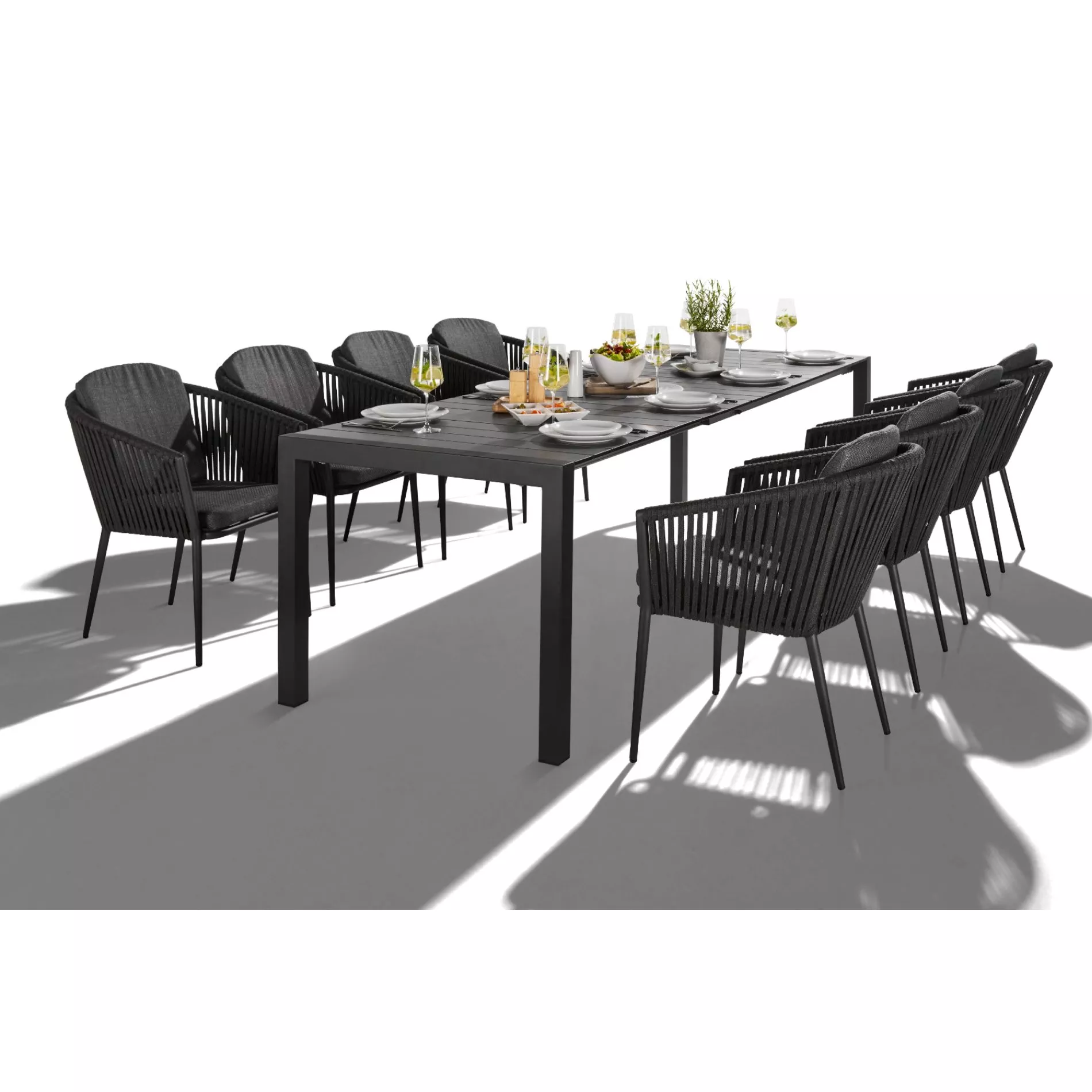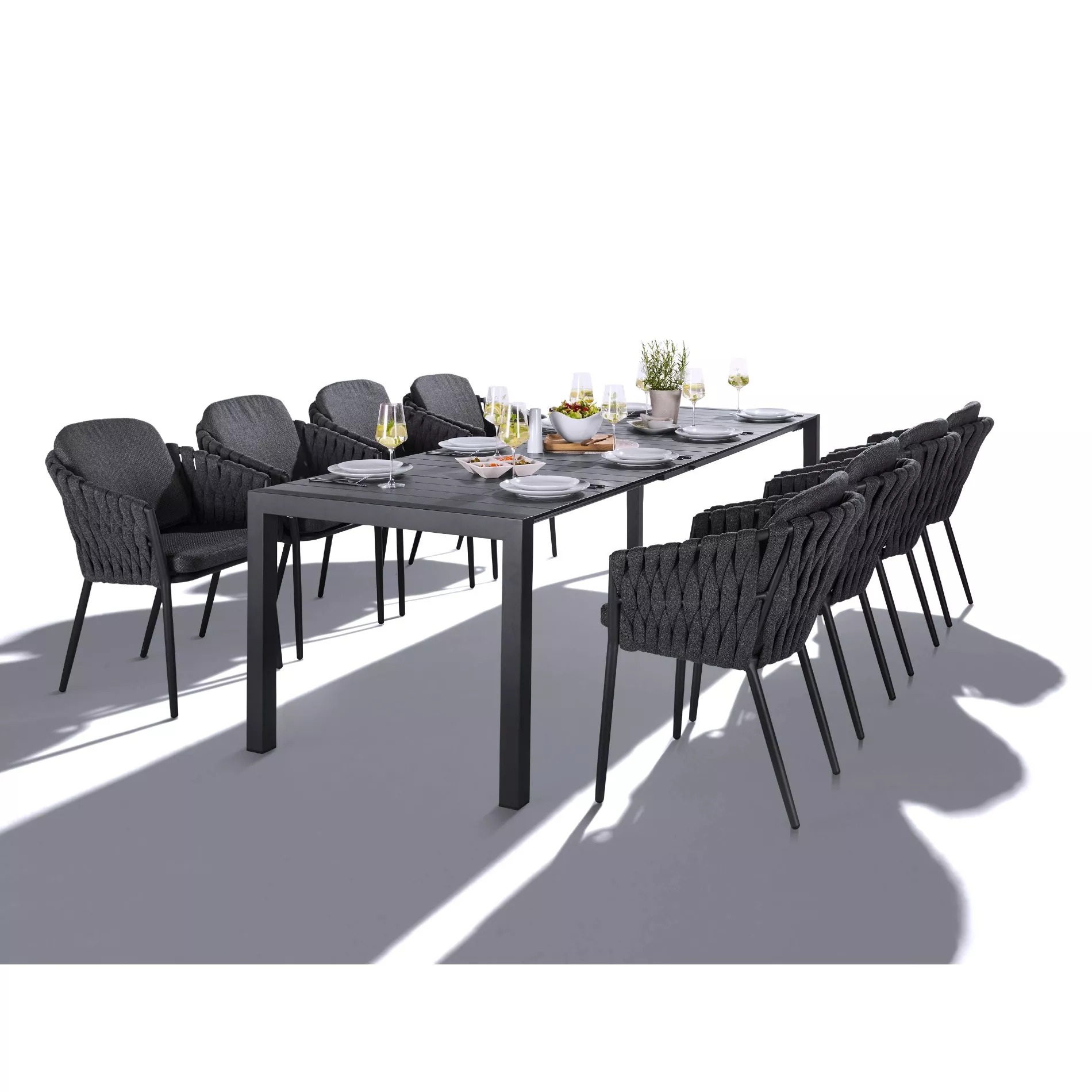 Der Ausziehtisch “Marano” lässt sich hervorragend mit Gartenstühlen aus Edelstahl oder Aluminium kombinieren, die ebenfalls mit einer Pulverbeschichtung in Anthrazit versehen sind. Ergänzen Sie Ihre Sitzgruppe mit passenden Kissen oder einem Sonnenschirm, um den Komfort zu erhöhen. Entdecken Sie unten verlinkte Produkte, die perfekt zu Ihrem neuen Tisch passen.