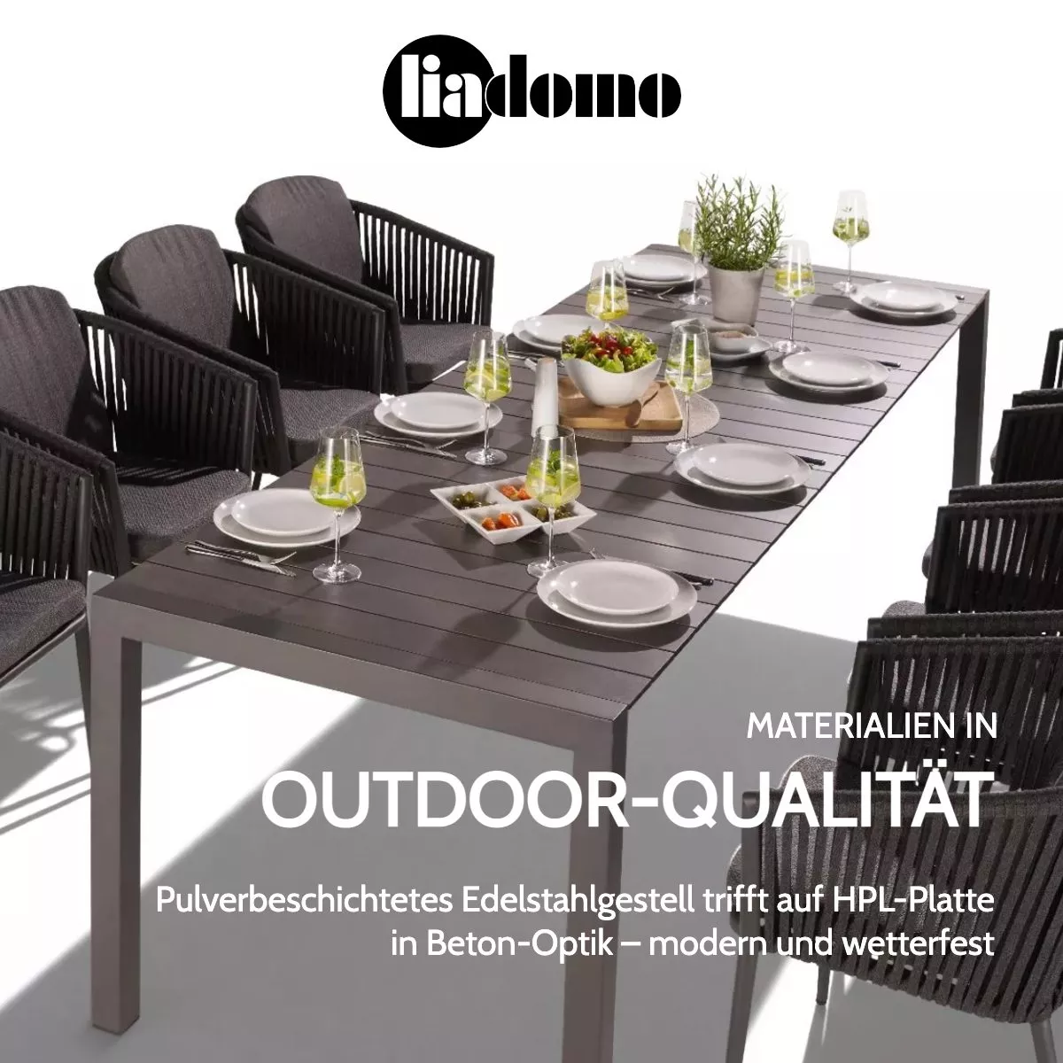 Die Tischplatte aus HPL (High Pressure Laminate) in Beton-Optik verleiht dem Tisch einen modernen Look und ist zudem kratzfest und pflegeleicht. Diese hochwertigen Materialien garantieren eine lange Lebensdauer und machen den Tisch ideal für den Einsatz im Freien.