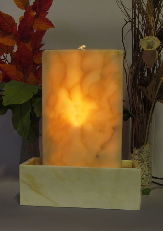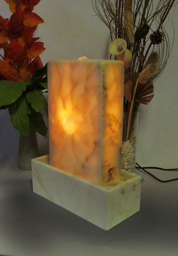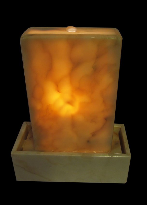 Der Brunnen besteht aus zwei Teilen. Die, mit der Standplatte verklebte ,Wasserwand über die das Wasser sanft hinunterrinnt und das aus dem gleichen Plattenmaterial gefertigte Becken, welches als Wasserreservoir dient. Hier im Becken sitzt die Unterwasserpumpe. Im Inneres des in Hohlbauweise gefertigten Oberteiles, sitzt ein 10 Watt Halogenlicht. Das Leuchtmittel kann bei Bedarf gewechselt werden.