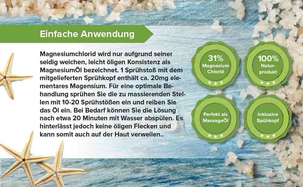 ✔️ WISSENSWERTE INFORMATION: Das als irrtümlich bezeichnete Magnesiumöl wird nur aufgrund der pflegenden, weichen Konsistenz als Öl bezeichnet. Eigentlich ist es jedoch kein Öl und hinterlässt somit auch keine öligen Flecken.