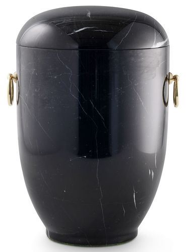 Die Naturstein-Urne besitzt eine polierte Oberfläche mit goldenen Griffen.