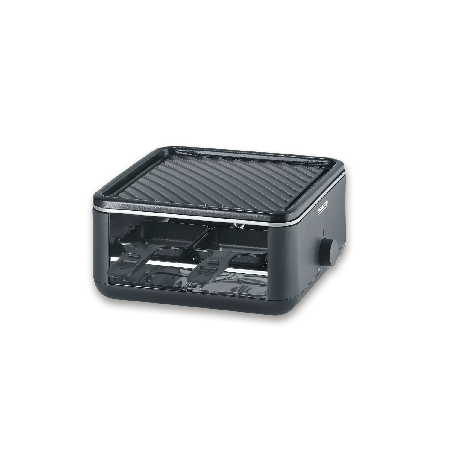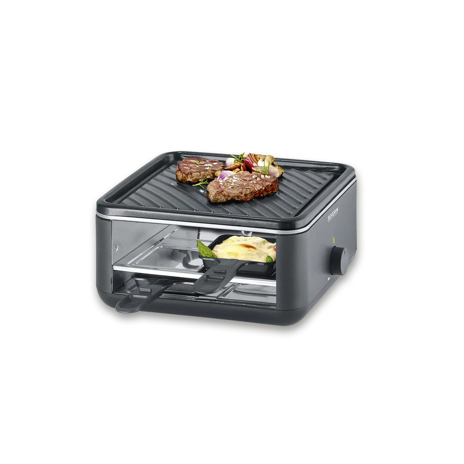 Raclette grill con 4 sartenes con revestimiento antiadherente y función de almacenamiento por clic. Incluye una superficie de asado de alta calidad con revestimiento cerámico perfecta para carne, pescado o verduras. Con nivel de estacionamiento para colocar las sartenes calientes o sin usar. Ajuste variable de la temperatura con iluminación LED y sartenes extra profundas de 20 mm para un llenado óptimo.