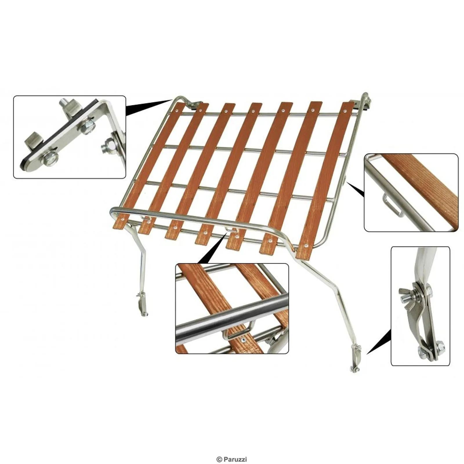 Die „klassischen“ Dachgepäckträger haben eine ziemlich quadratische Form, während unser Volkswagen Beetle und Karmann Ghia nicht gerade als quadratisch bezeichnet werden können. Viel schöner wäre es, wenn der Gepäckträger den Konturen der Karosserieform folgen würde. Vor diesem Hintergrund haben die Macher des Gepäckträgers „Vintage“ begonnen, einen Gepäckträger zu entwickeln, der den Konturen folgt. Das Ergebnis kann als grandios bezeichnet werden, ein Gepäckträger, der sehr klassisch aussieht, komplett mit der Dachlinie verläuft, aus poliertem Edelstahl besteht und mit Holzbalken ausgestattet ist, die wie eine Wabe mit viel Liebe zum Detail verbunden sind. Die Montage erfolgt über die Regenrinnen mit dem mitgelieferten (Edelstahl) Befestigungsmaterial. Erhältlich für Volkswagen Beetle und Karmann Ghia, mit Ausnahme der Cabrio-Versionen.