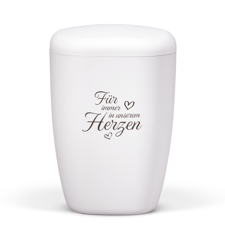 Naturstoffurne, Weiß-Matt, Lasergravur, “Für immer in unseren Herzen”