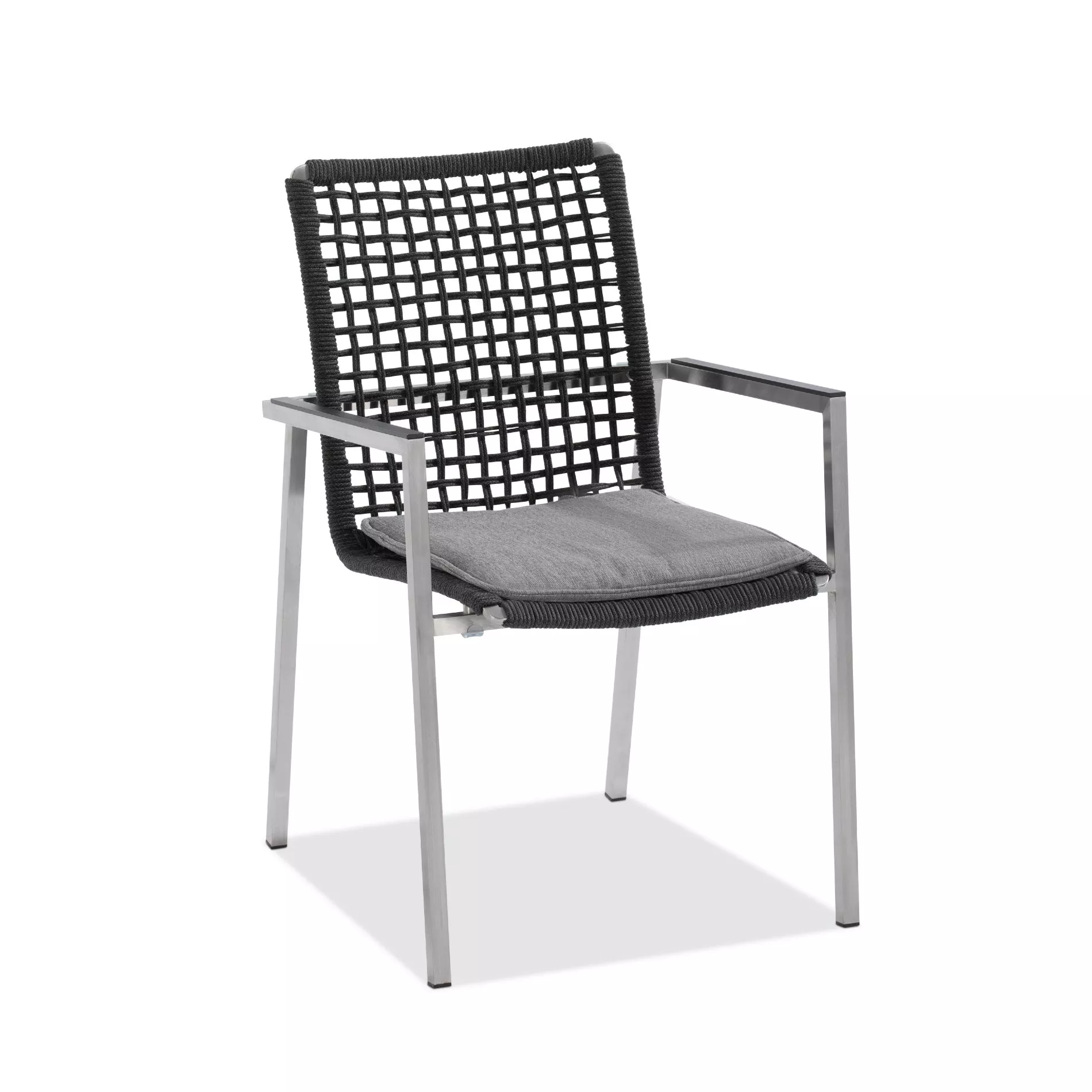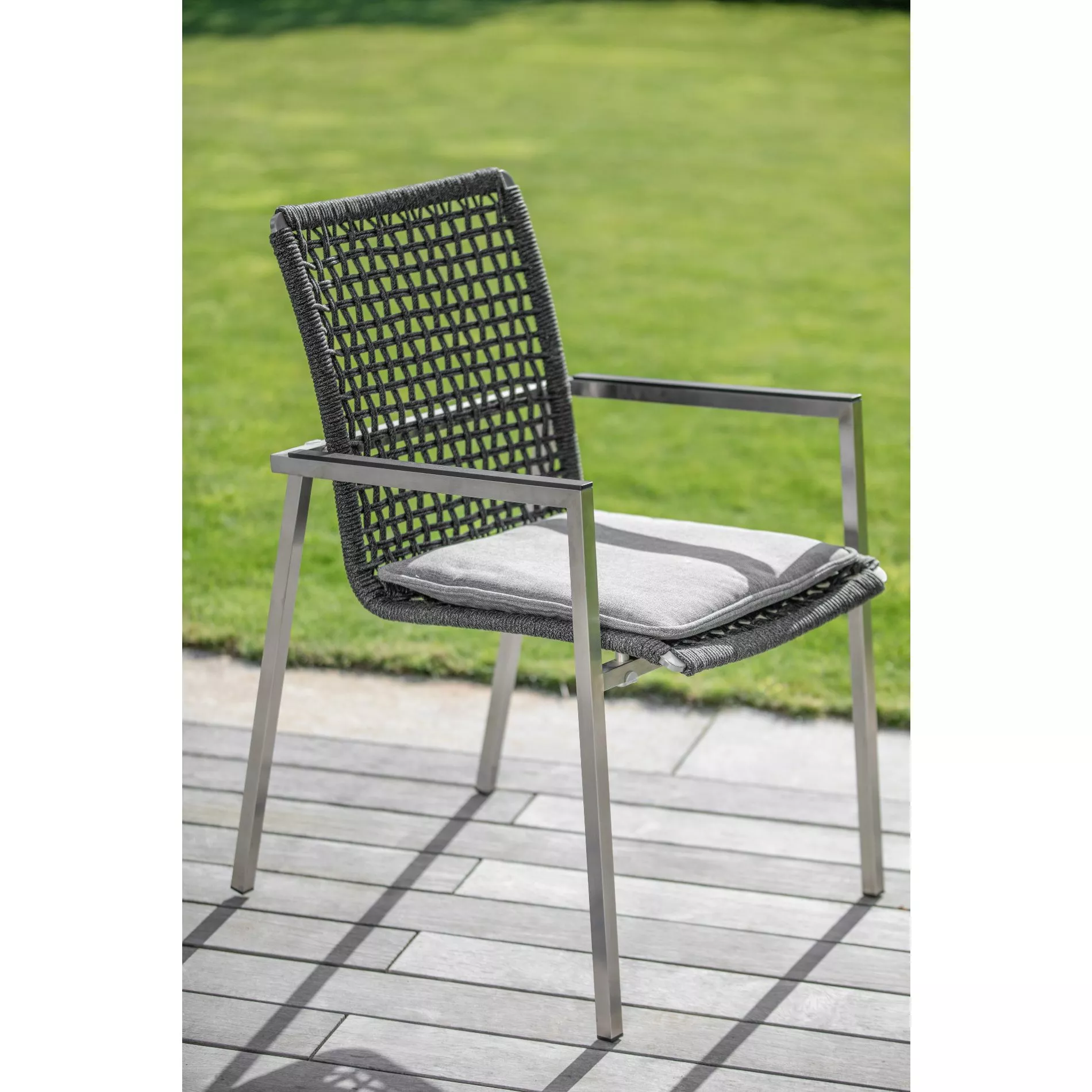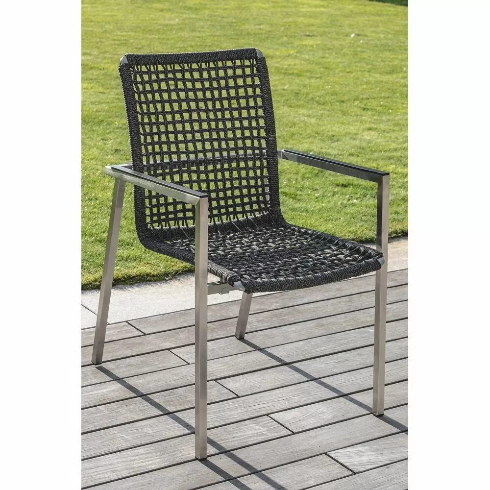 verfügt über ein Gestell aus Edelstahl (gebürstet). Edelstahl ist aufgrund der hohen Korrosionsbeständigkeit besonders beliebt. Das langlebige Metall ist schwerer als Aluminium und schenkt Gartenmöbeln eine schöne Standfestigkeit und hohe Stabilität, auch bei sehr schlanken Designs. Die Armlehnen haben eine schwarze Aluminium-Auflage, die wunderbar mit der Kordelflechtung harmoniert. Blickfang des Gartensessels ist die attraktive Kordelflechtung in Grau. Niehoff setzt eine witterungsbeständige Kordel aus Polypropylen ein. Die durchgefärbte Kunststoffkordel ist wasserabweisend, UV-beständig, reißfest und formstabil.