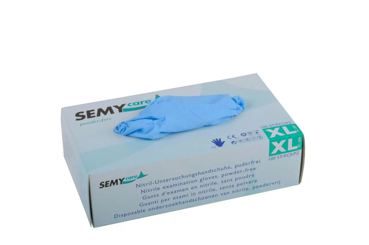 Alle blauen Nitril Einweghandschuhe von SemyCare sind in den Größen S-XL erhältlich.