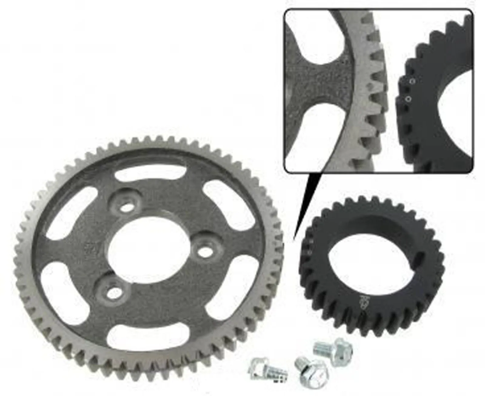 Wenn Sie den Satz mit der Verstelloption wählen, ist das Nockenwellenrad um 2 oder 4 Grad verstellbar (verwenden Sie die schwarzen Verstellscheiben, wenn keine Verstellung erforderlich ist), Sie können dies nachträglich durch die Ölpumpenbohrung einstellen.