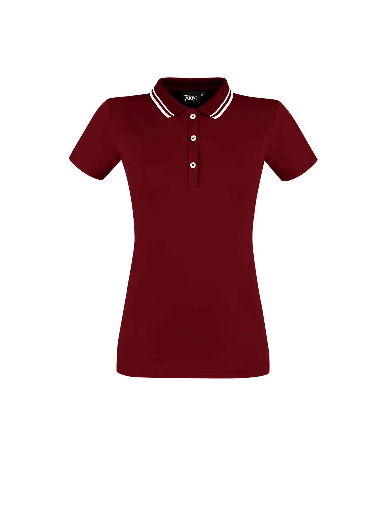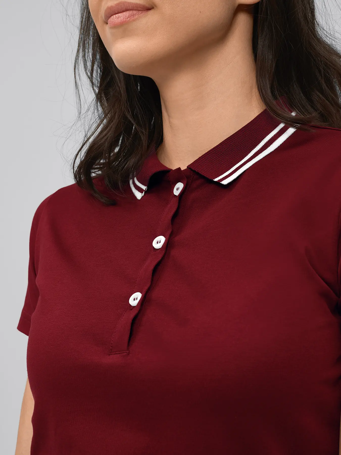 Figurbetonendes Damen-Poloshirt, 3-Loch-Knopfleiste, Strickkragen mit weißen Streifen, ¼-Arm, Seitenschlitze. Rückenlänge Gr. S ca. 65 cm. Formstabile und elastische Qualität aus 95% Baumwolle/5% Elasthan, 180 g/m2, Single Jersey, 60°-Wäsche.