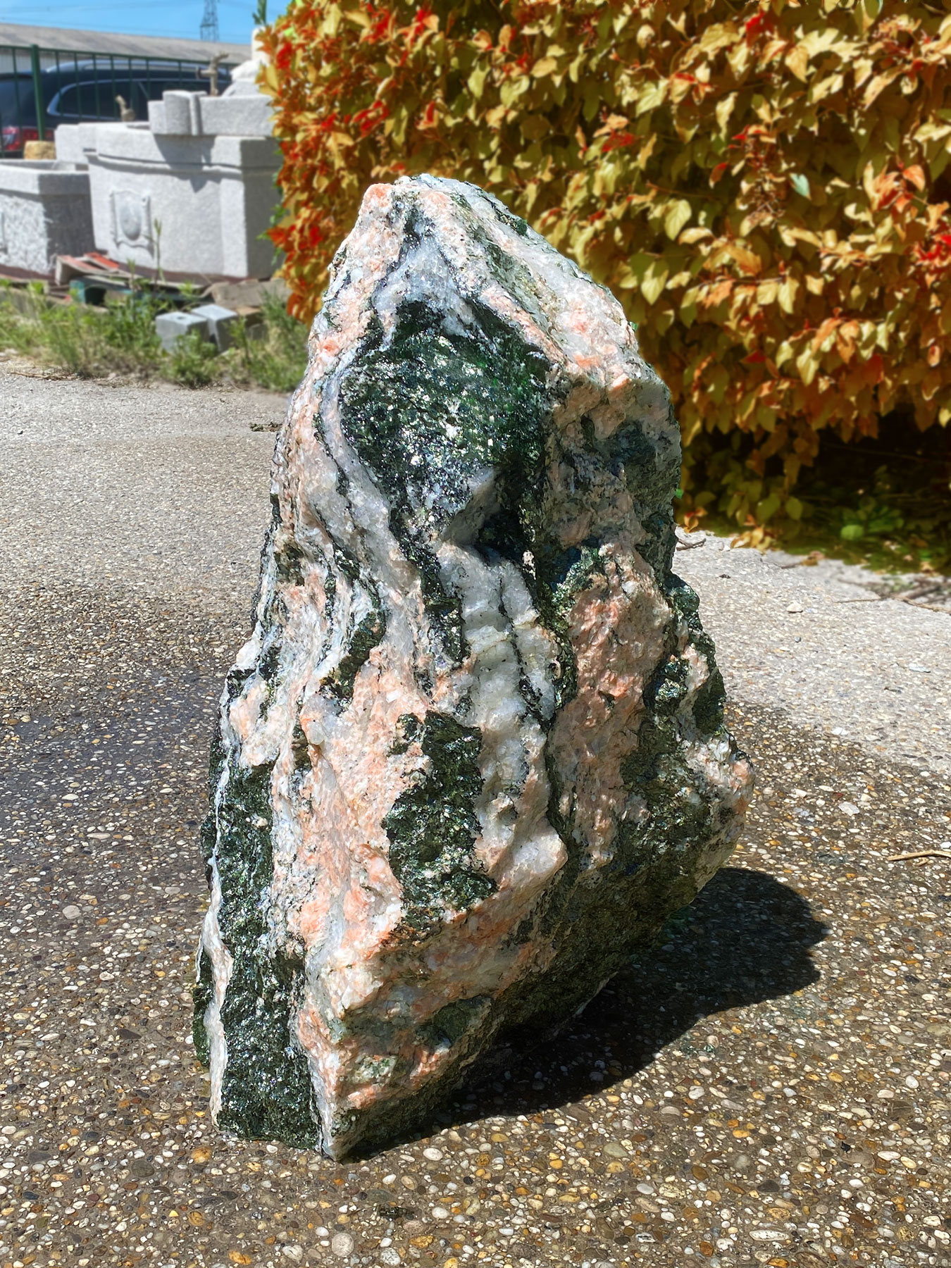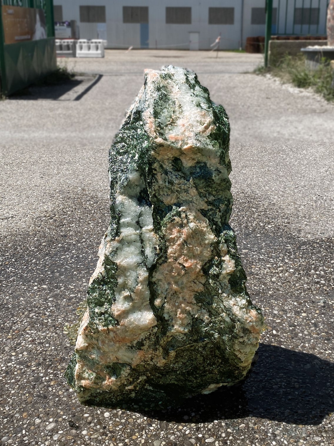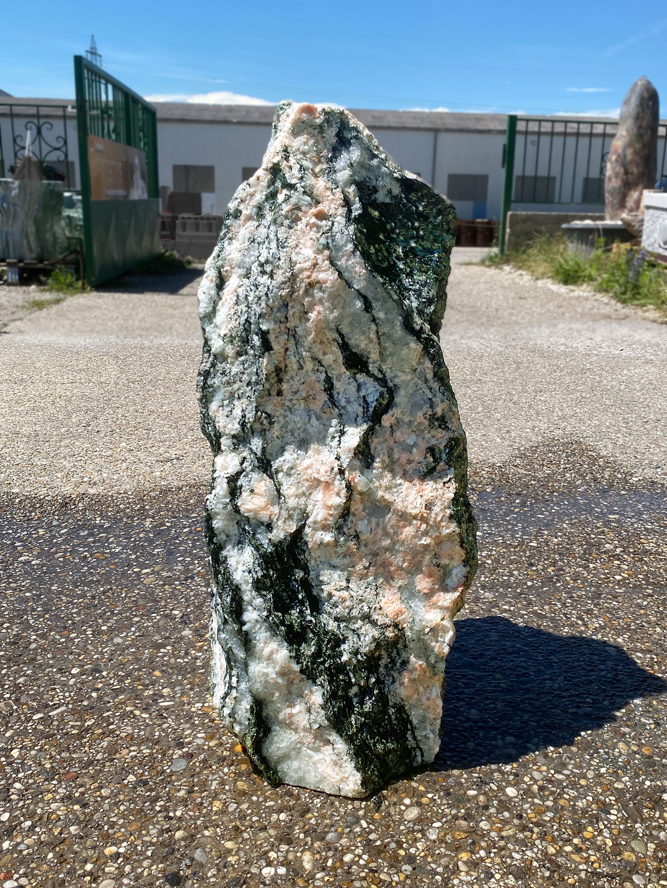 Atemberaubend ist dieser wundervoll gefärbte und geäderte Quarzit mit einem extra hohen Anteil an Fuchsit. Der Stein stammt aus dem hohen Norden Norwegens, oberhalb des Polarkreises. Er beeindruckt mit seinem satten tiefen Grün und rosa farbigen Einschlüssen.