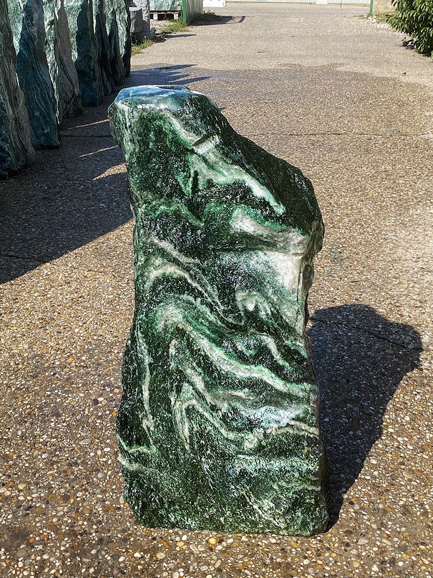 Atemberaubend ist dieser wundervoll gefärbte und geäderte Quarzit mit einem hohen Anteil an Fuchsit. Der Stein stammt aus dem hohen Norden Norwegens, oberhalb des Polarkreises. Er beeindruckt mit seinem satten, tiefen Grün.